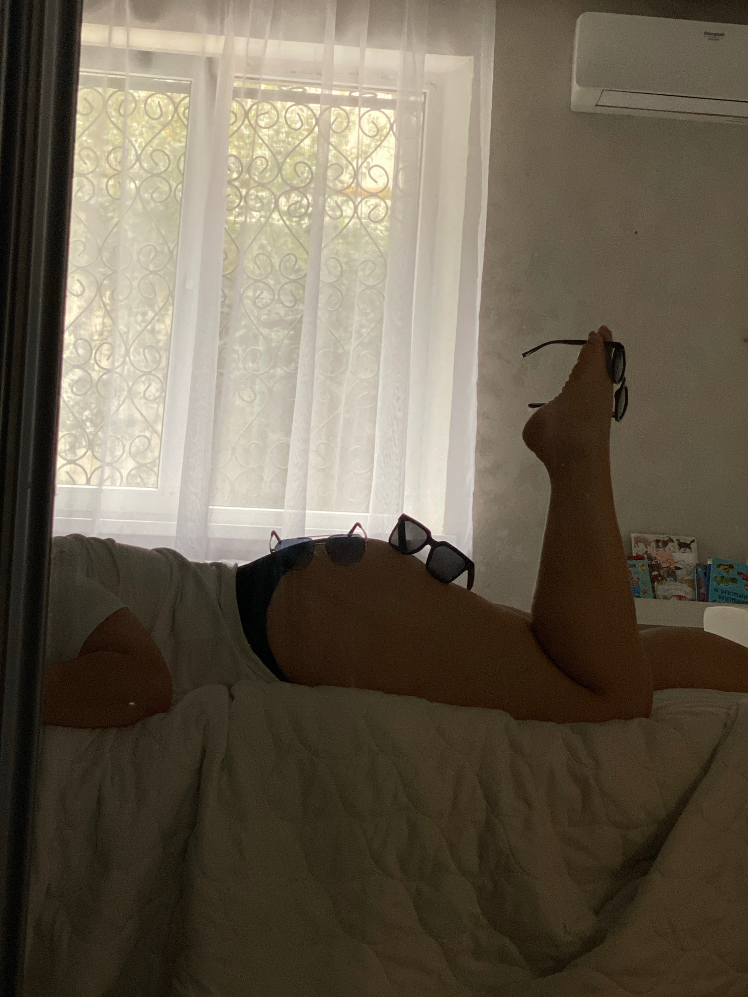 A person's legs are held up in the air, with sunglasses balanced on the foot. Another pair of sunglasses is balanced on the thigh. The person is wearing a white shirt and dark underwear. The backgroun…read more