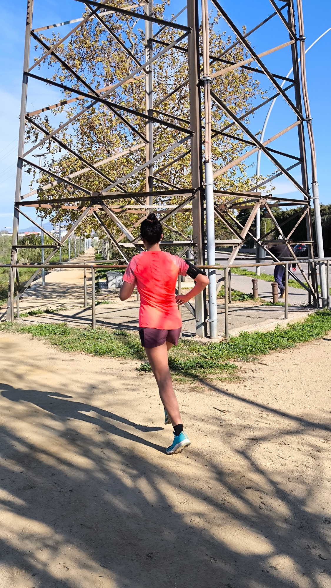The image depicts a runner on a dirt path within a park setting in Ripollet, Spain. The runner, a woman with dark hair in a bun, is wearing a red t-shirt, purple shorts, and blue running shoes with bl…read more