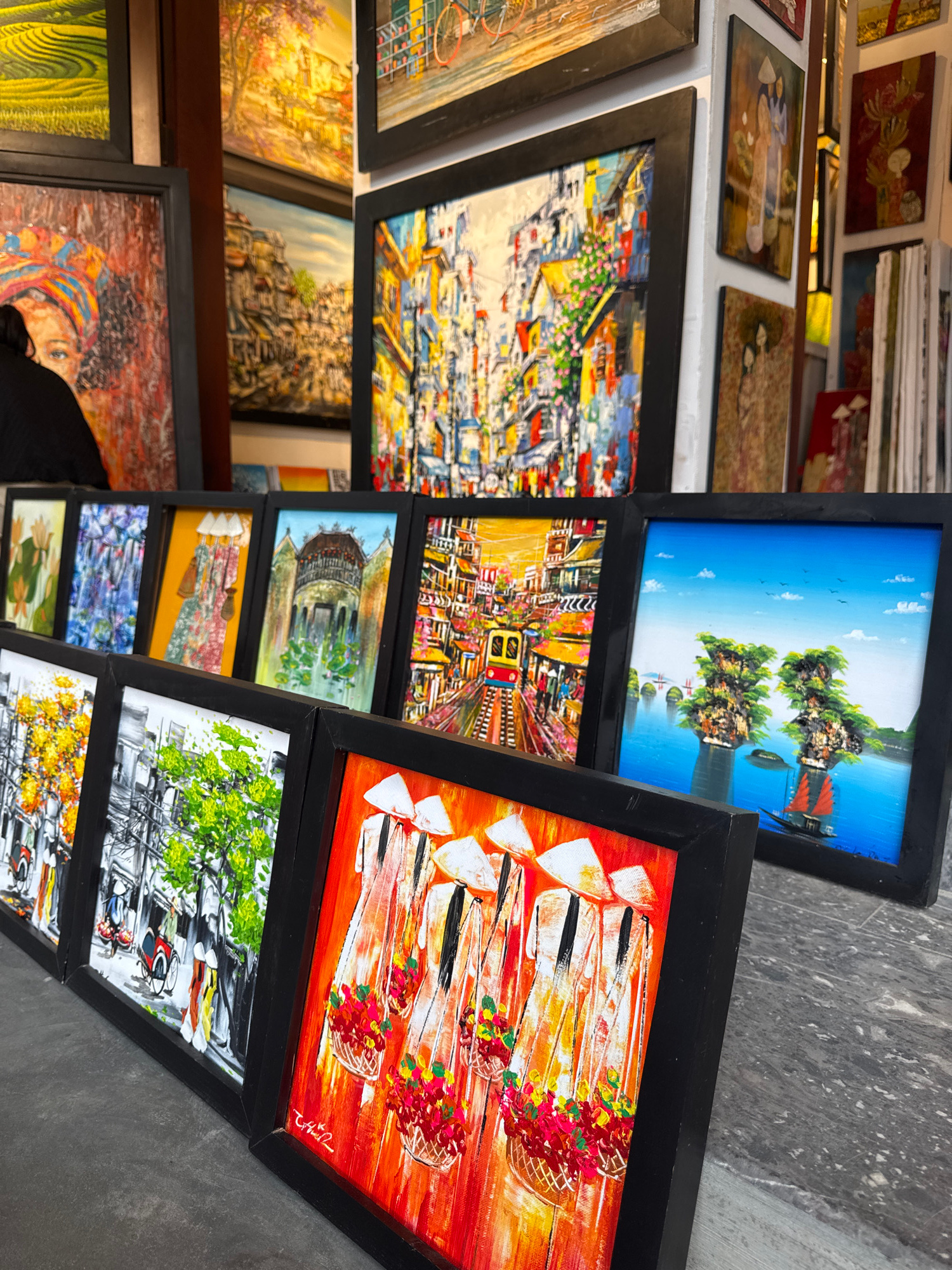 The image displays a vibrant and densely packed collection of framed paintings, likely presented in an art shop or gallery in Hội An, Vietnam. Numerous artworks, primarily set in black frames, are arr…read more