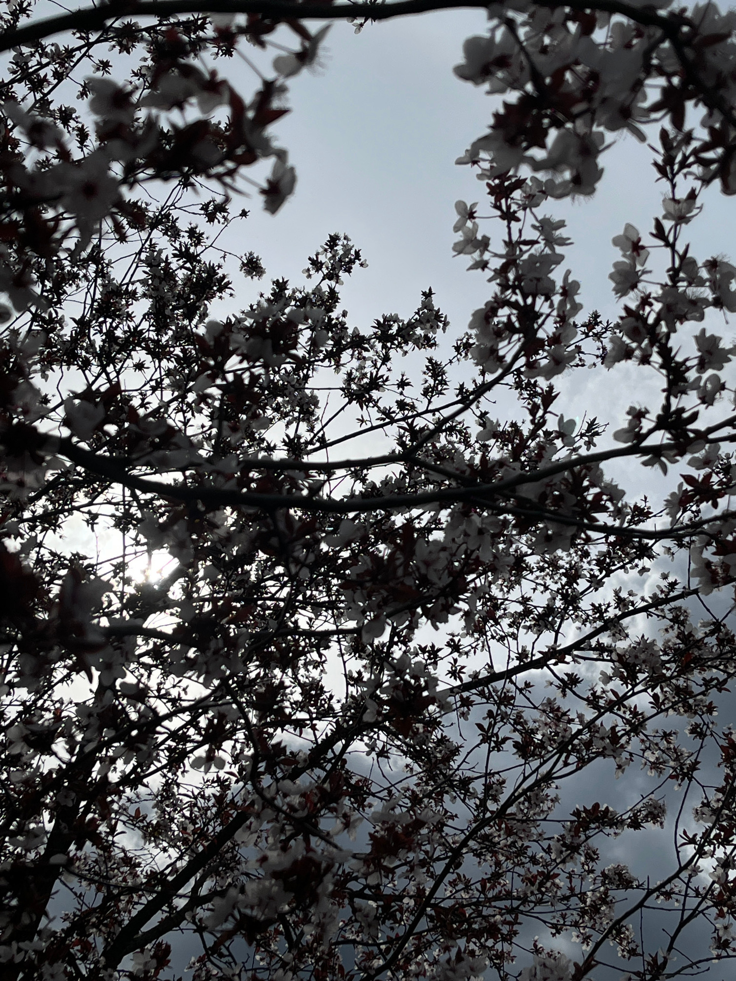 The image is a low-angle shot of a flowering tree with white blossoms against a cloudy sky. The sun is visible through the branches, creating a bright spot in the center of the frame. The branches and…read more