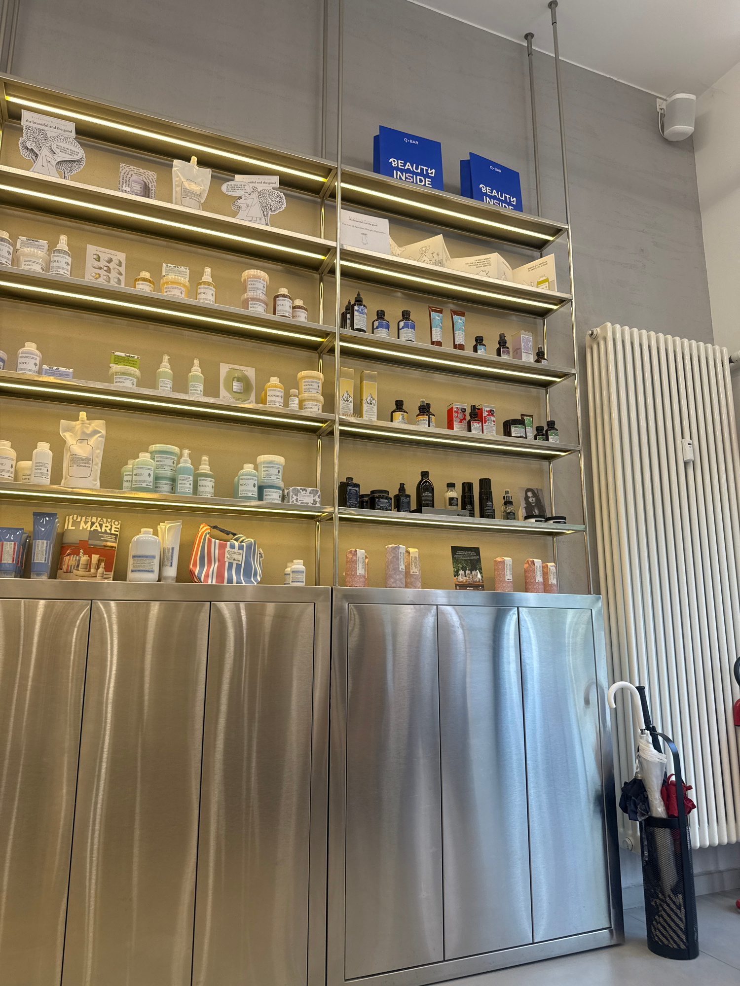 This image depicts an interior view of a modern retail space, likely a beauty or personal care shop, situated in Milan, Italy. The environment features a clean and contemporary design, with no people…read more