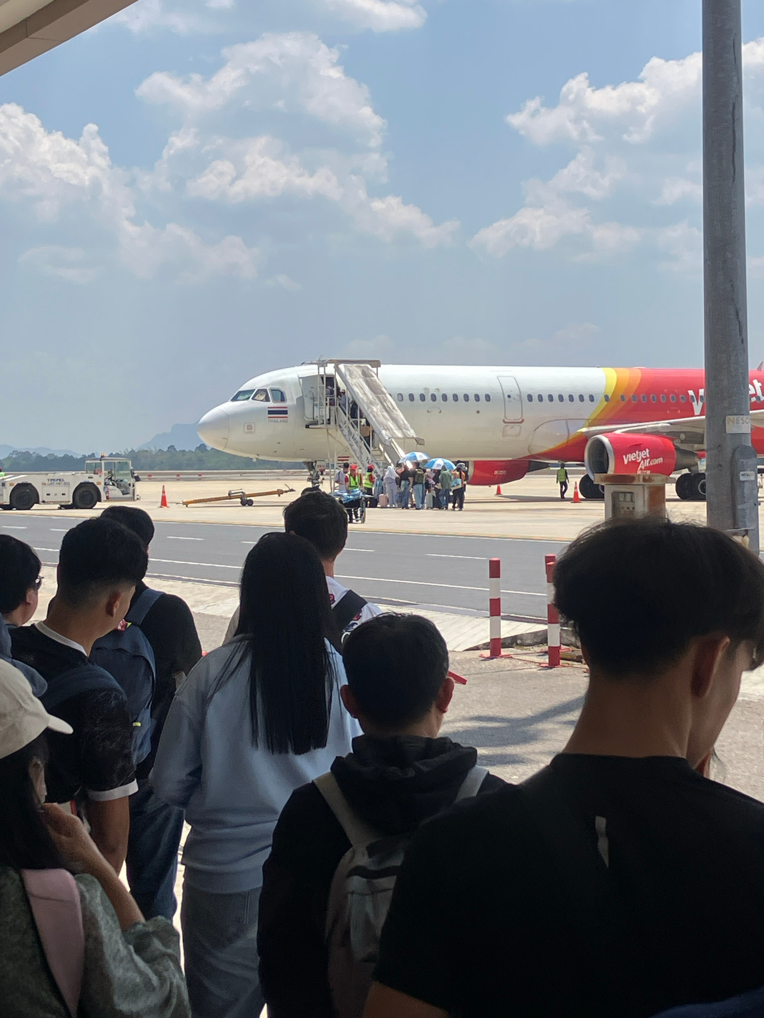 The image shows a group of people at an airport in Tambon Hua Toei, Thailand, watching passengers disembark from a Vietjet aircraft. The plane is red and white. Passengers are using a stairway connect…read more