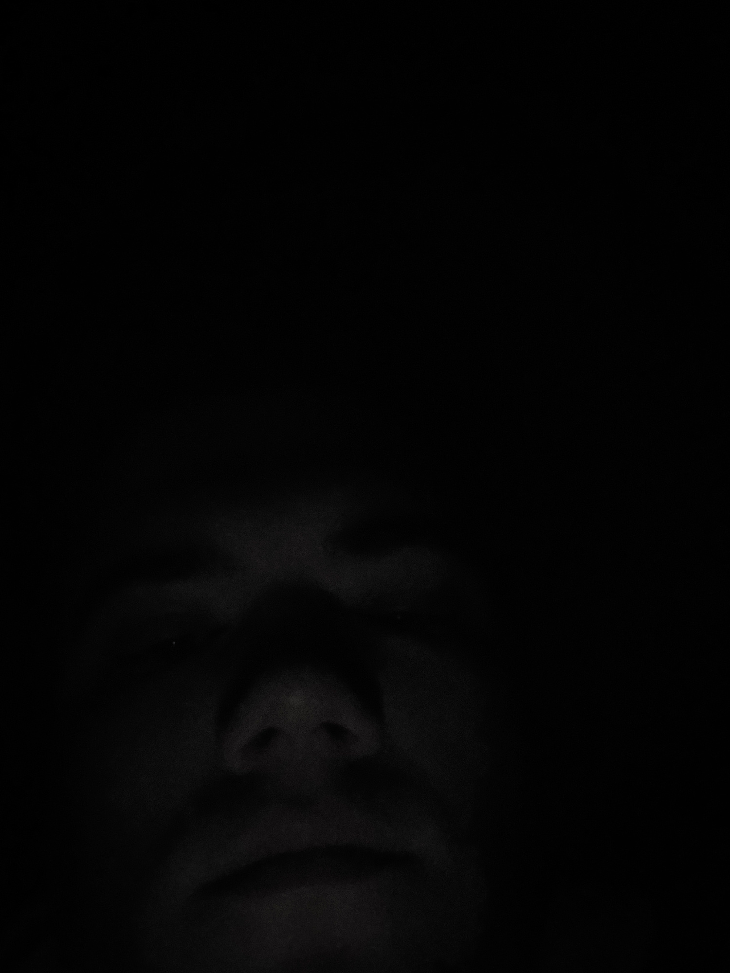 A close-up, dimly lit image features the face of a person. The face is slightly rotated, positioned on the left side of the frame. The darkness obscures many details, but the nose and some facial cont…read more