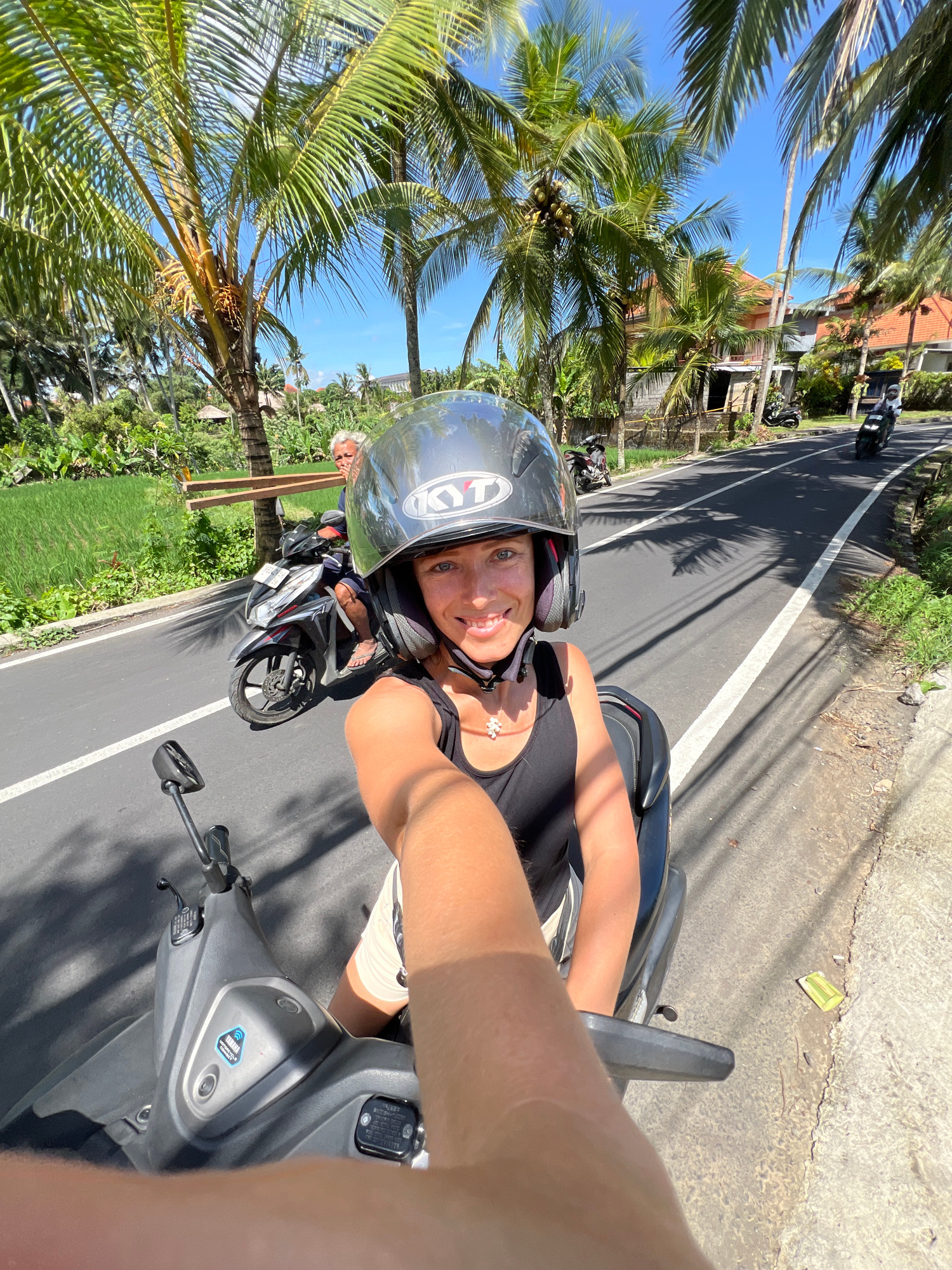 A woman wearing a helmet is taking a selfie while riding a scooter on a road in Ubud, Indonesia. She is wearing a black tank top and a necklace with flower pendants. The background includes palm trees…read more