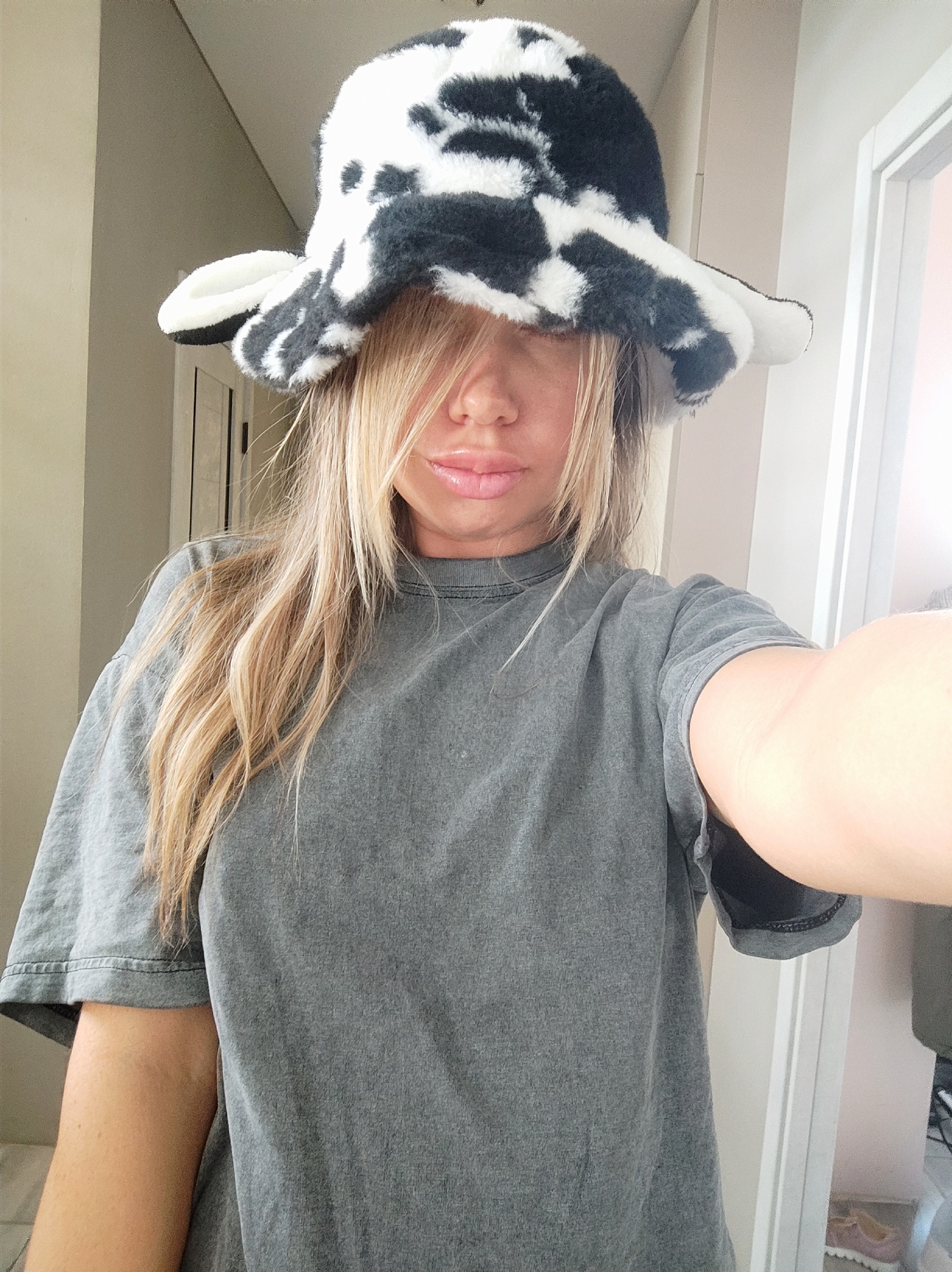 The scene is located in the city of Votkinsk, Russia, and depicts a close-up, chest-up selfie of an individual, likely female, taken indoors. The individual has long, light blonde hair, parted roughly…read more