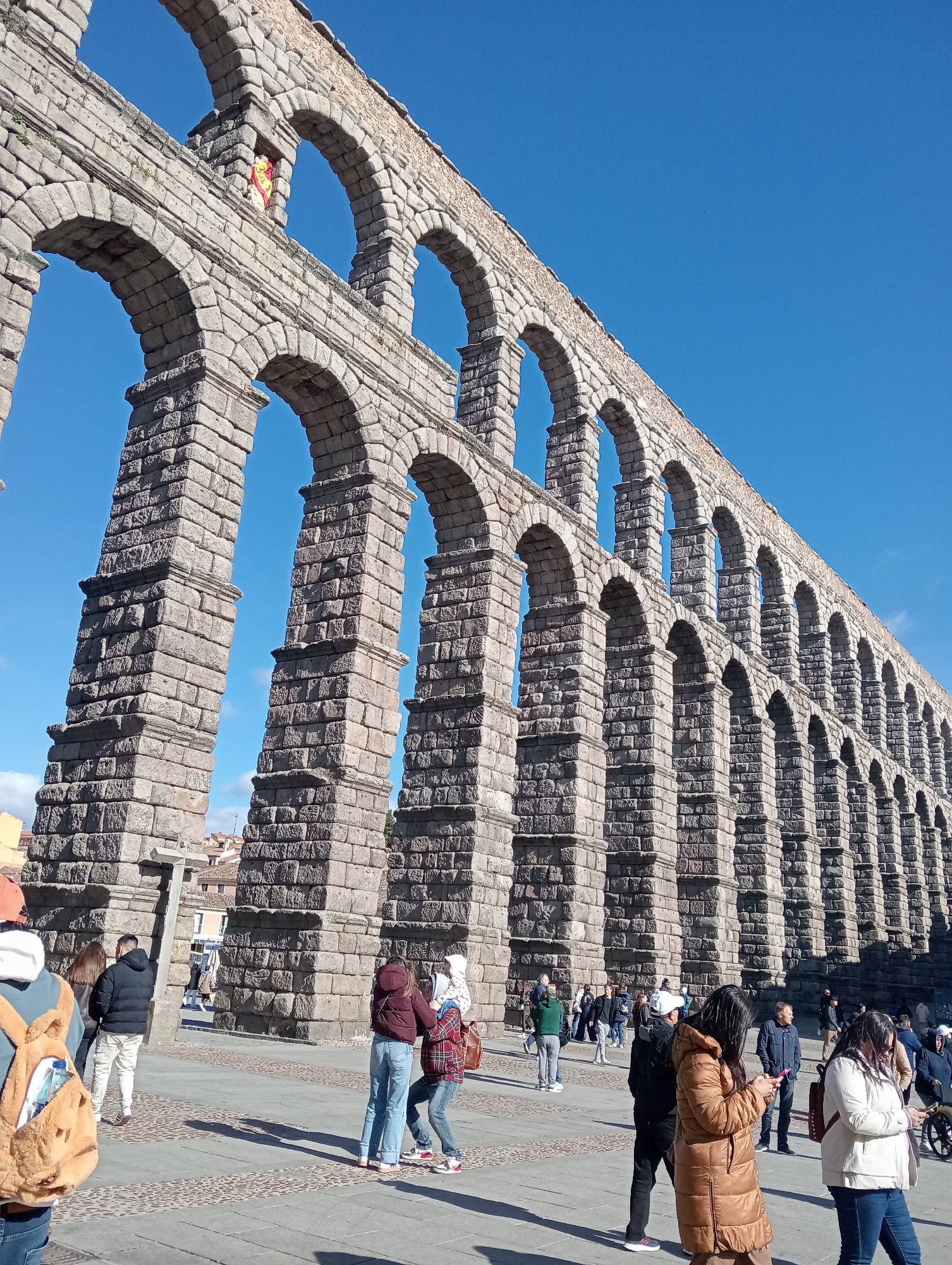 The image depicts a sunny day at the Aqueduct of Segovia, Spain. The ancient Roman aqueduct, constructed of large stone blocks, dominates the scene with its arches extending into the distance. People…read more