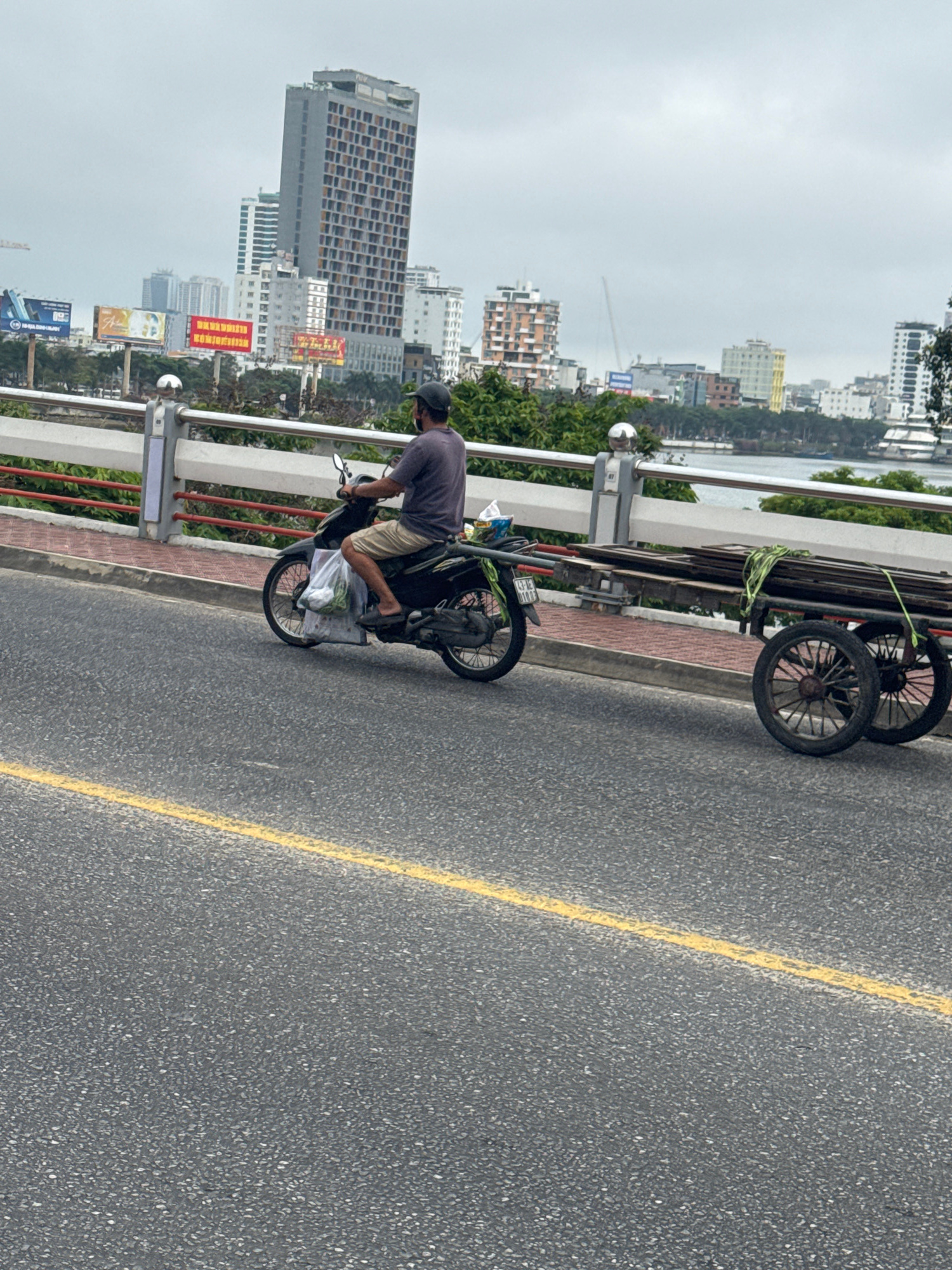 A man riding a motorcycle is positioned on the right side of a city street in Da Nang, Vietnam, near the railing of a bridge. He is wearing a dark shirt, light shorts, and a dark cap. The motorcycle i…read more
