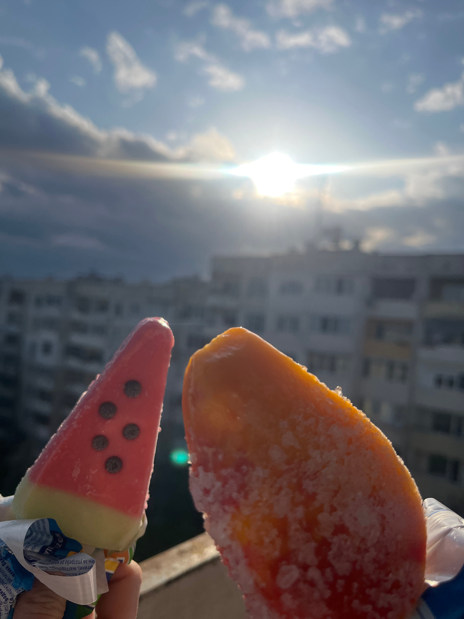 Here is a description of the image: The photo shows two ice pops held up against a bright, sunny sky. The sun's glare is intense. A building, possibly an apartment block, is visible in the background…read more