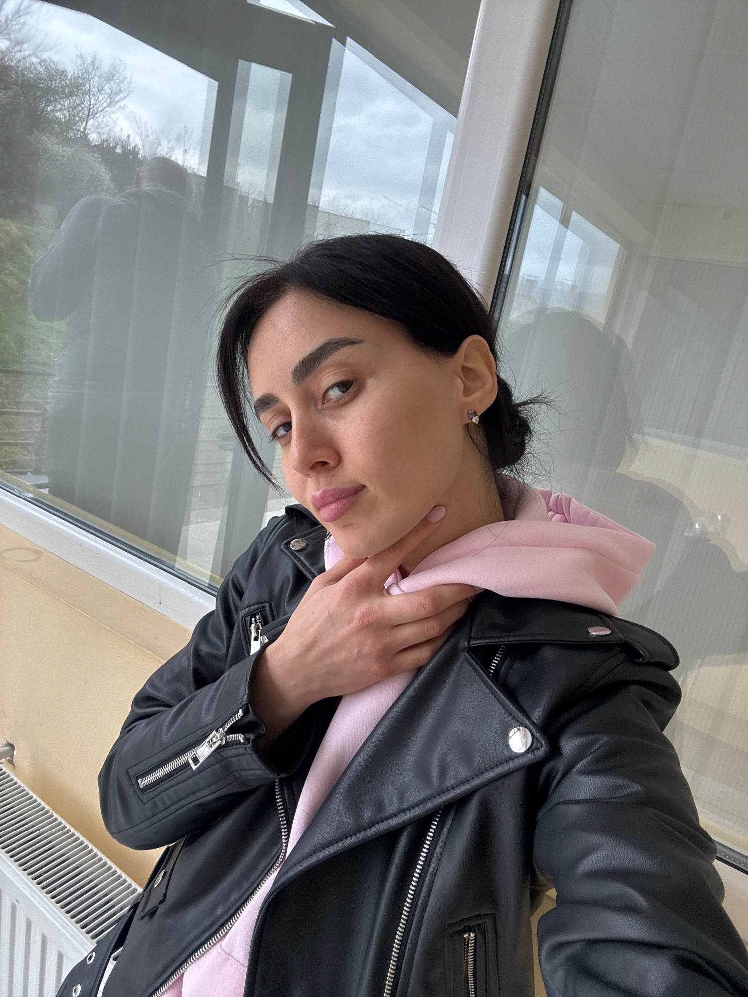 A woman is standing indoors near a window. She is wearing a black leather jacket over a pink hooded sweatshirt. She has dark hair pulled back in a bun and is wearing stud earrings. Her right hand is l…read more