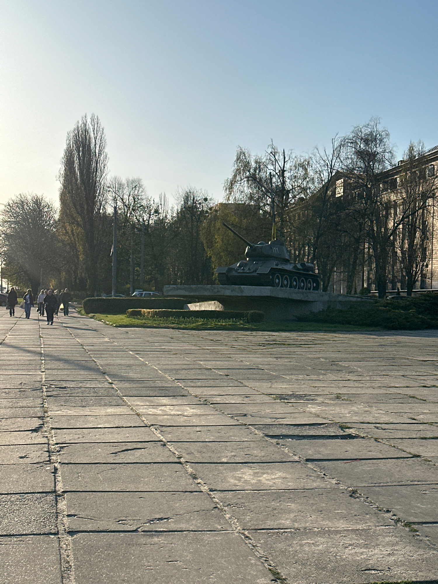 The image shows a tank monument in Kyiv, Ukraine, positioned on a concrete pedestal. To the right of the tank monument lies a paved area constructed from rectangular slabs, and a trimmed hedge bordersβ¦read more