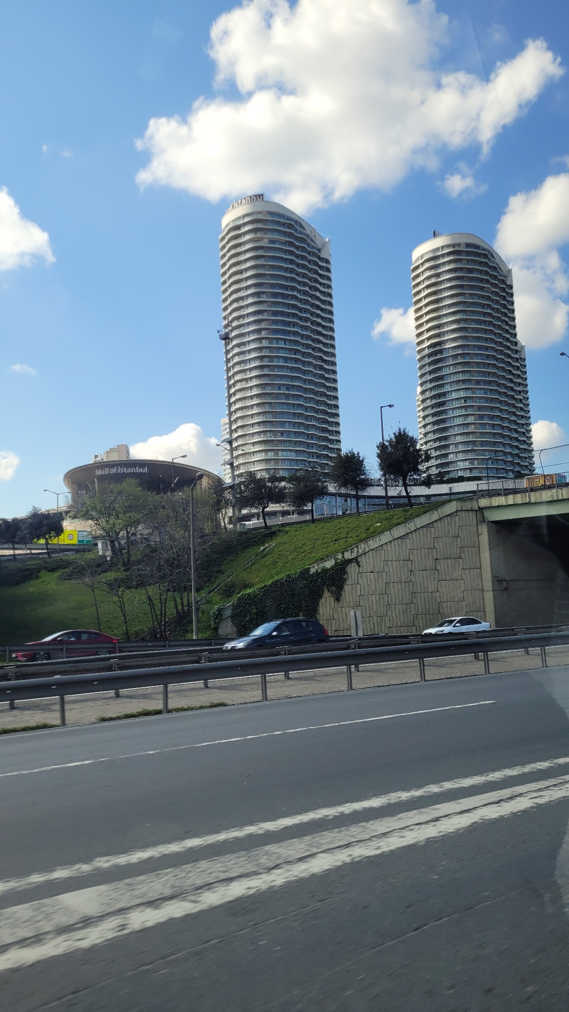The image depicts two high-rise buildings with curved facades, suggestive of modern architecture, under a blue sky with scattered white clouds. A roadside scene is visible, including a road with multi…read more