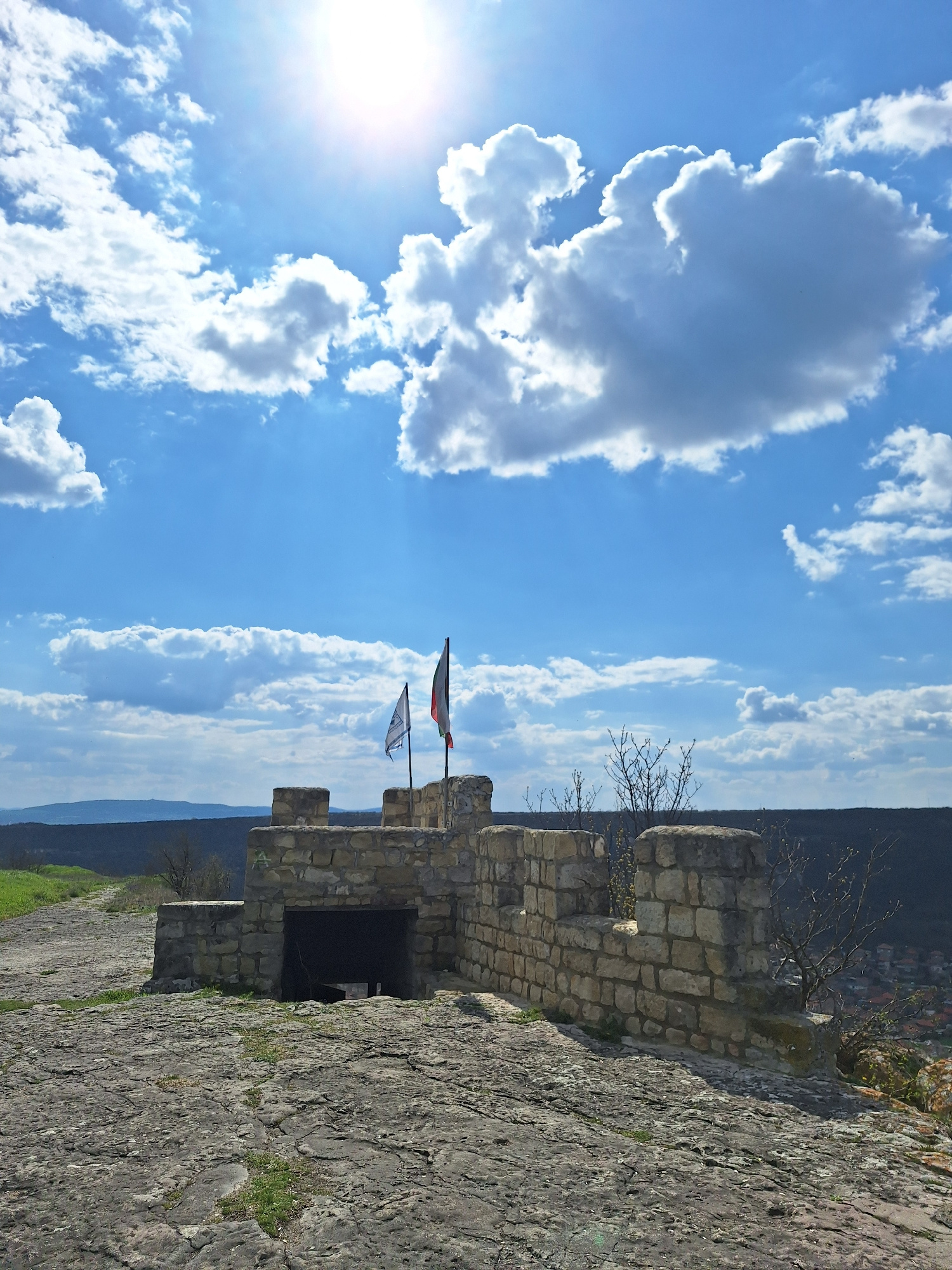 The image shows the Ovech Fortress in Provadia, Bulgaria, seen from a low angle, looking upward. The fortress wall, constructed from light-colored stone, runs along the right side of the frame. Two fl…read more