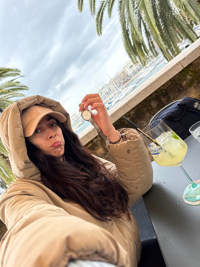 A female individual is depicted in a close-up selfie, wearing a tan hooded puffer jacket with the hood up and a beige baseball cap underneath. Her dark hair flows over her shoulders, and her facial ex…read more