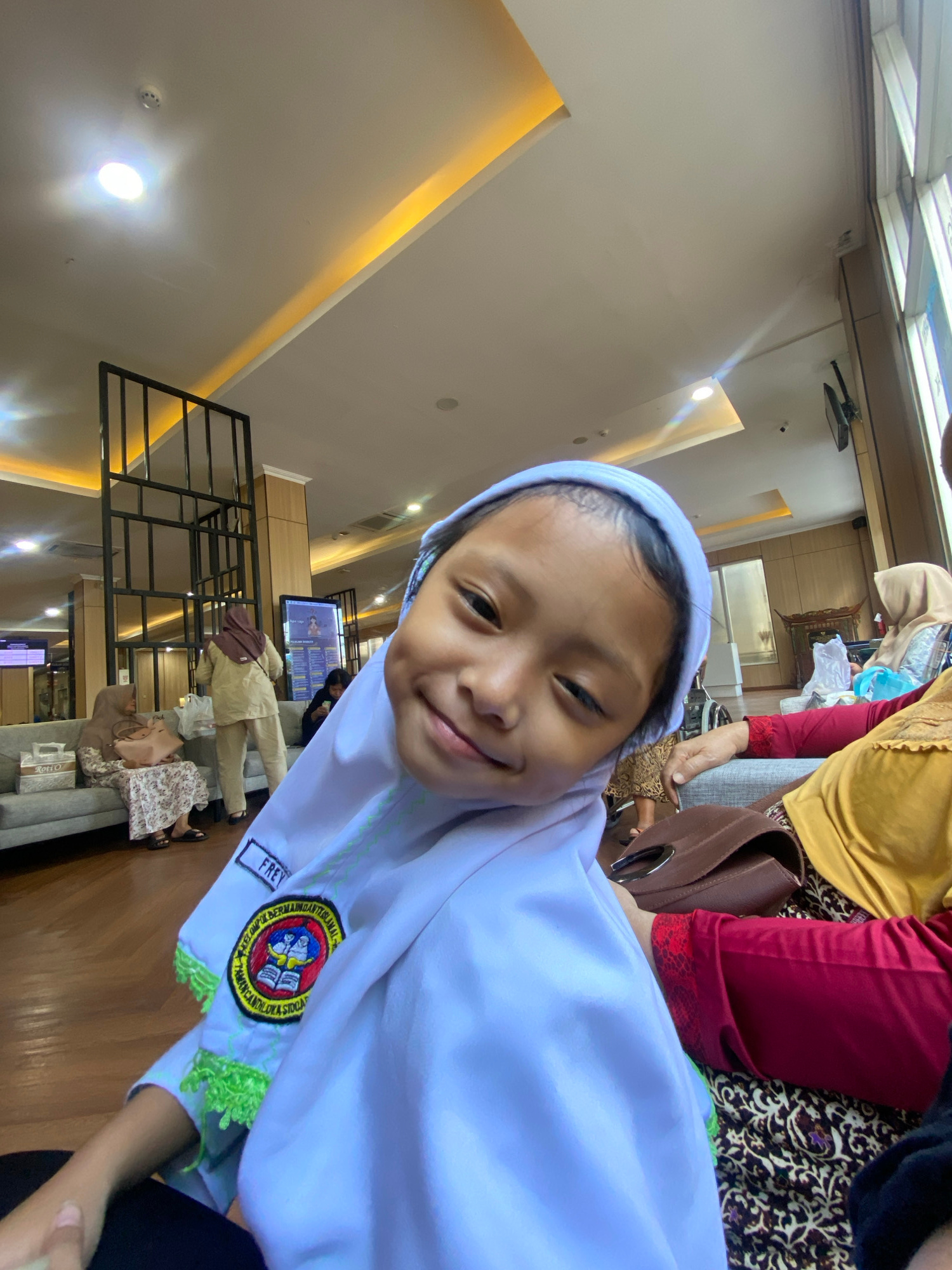 A young girl wearing a light blue hijab and school uniform with the "FREY" patch and an emblem, is smiling. She is sitting in a waiting area in Sidoarjo, Indonesia, with several other people and furni…read more