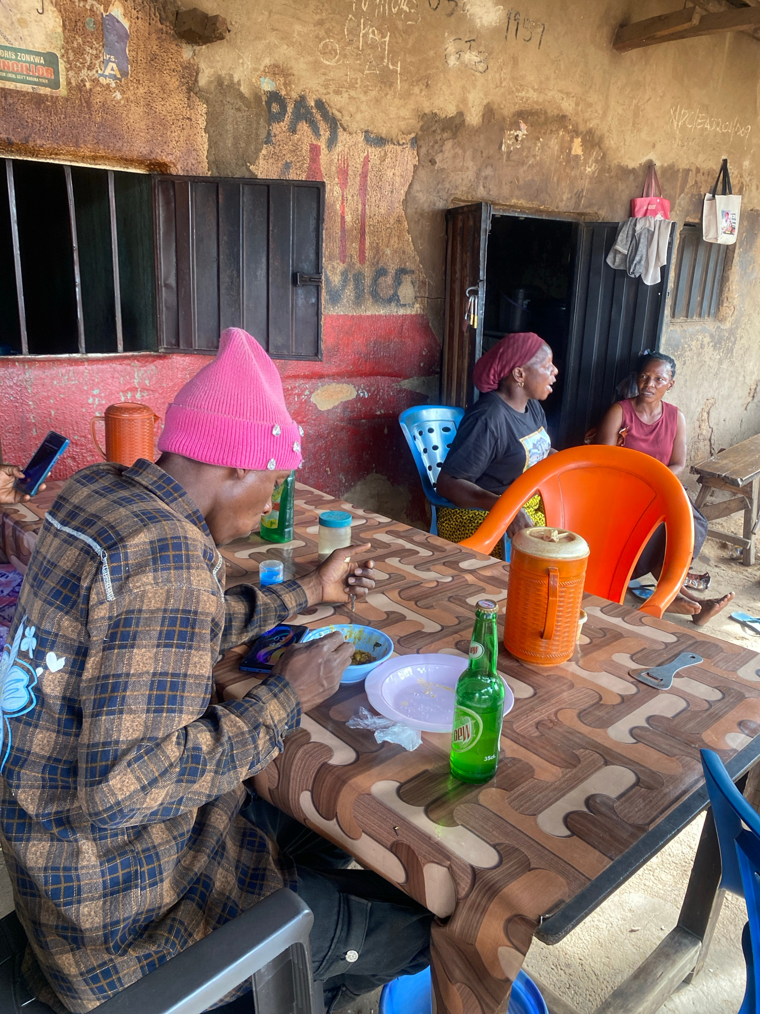 The image captures a scene in Rido, Nigeria. A man wearing a pink beanie and a plaid shirt is seated at a brown patterned table, holding a green bottle to his mouth. He has a blue smartphone in his ha…read more