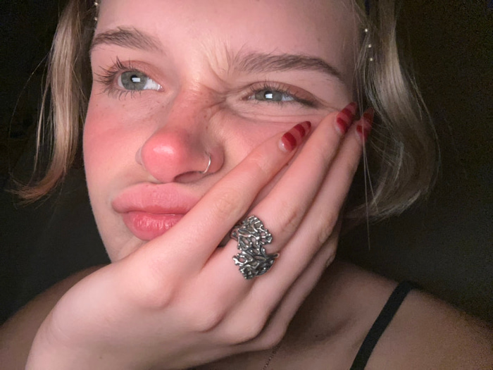 An inverted close-up captures a person's face partially obscured by their hand, adorned with a large, intricate silver ring. The individual has light skin, light-colored hair, and wears a nose ring. R…read more