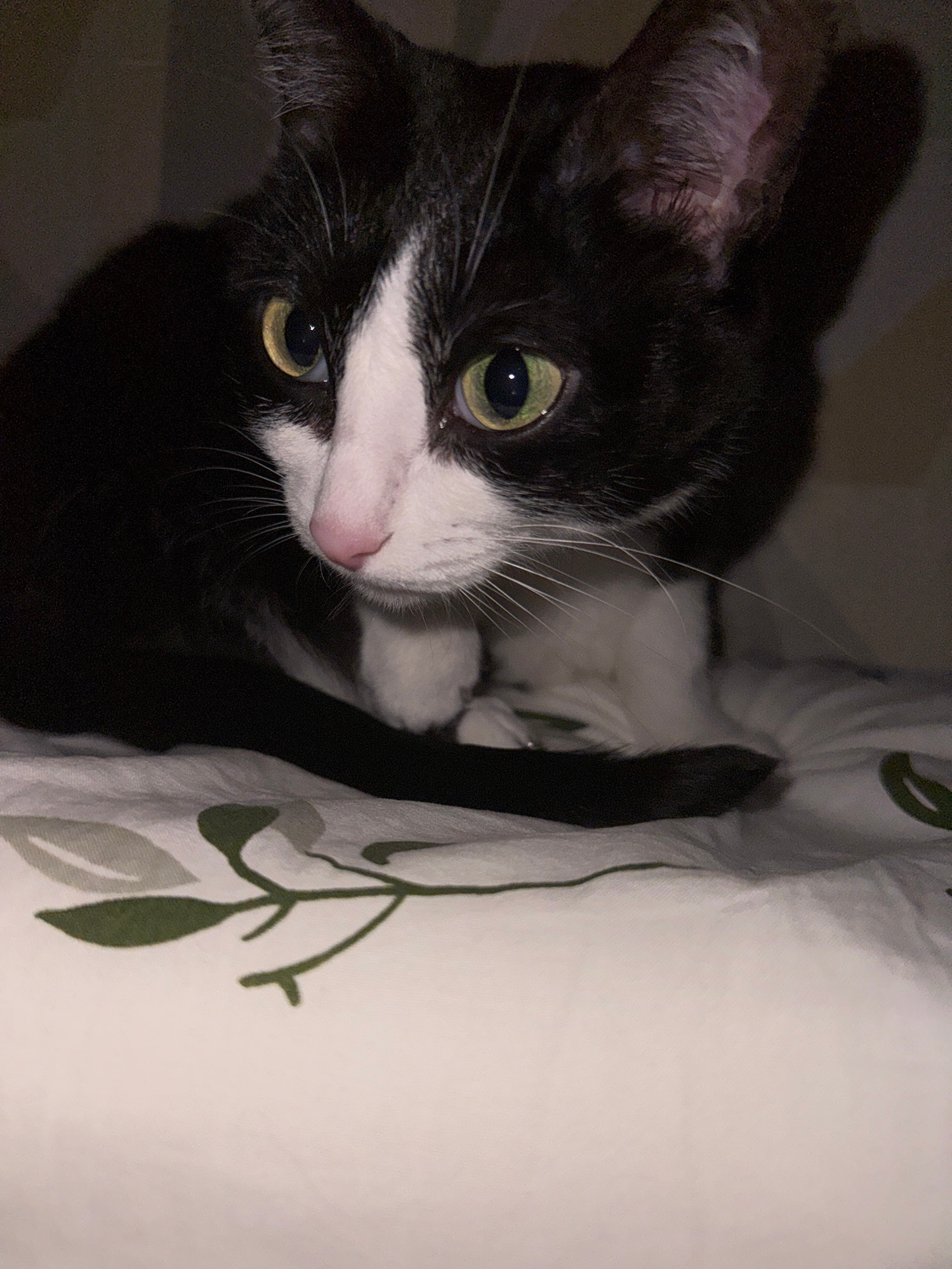 A close-up, slightly rotated image captures a black and white cat lying on a light-colored surface adorned with green leaf patterns. The cat's face, featuring yellow-green eyes and a pink nose, is dir…read more