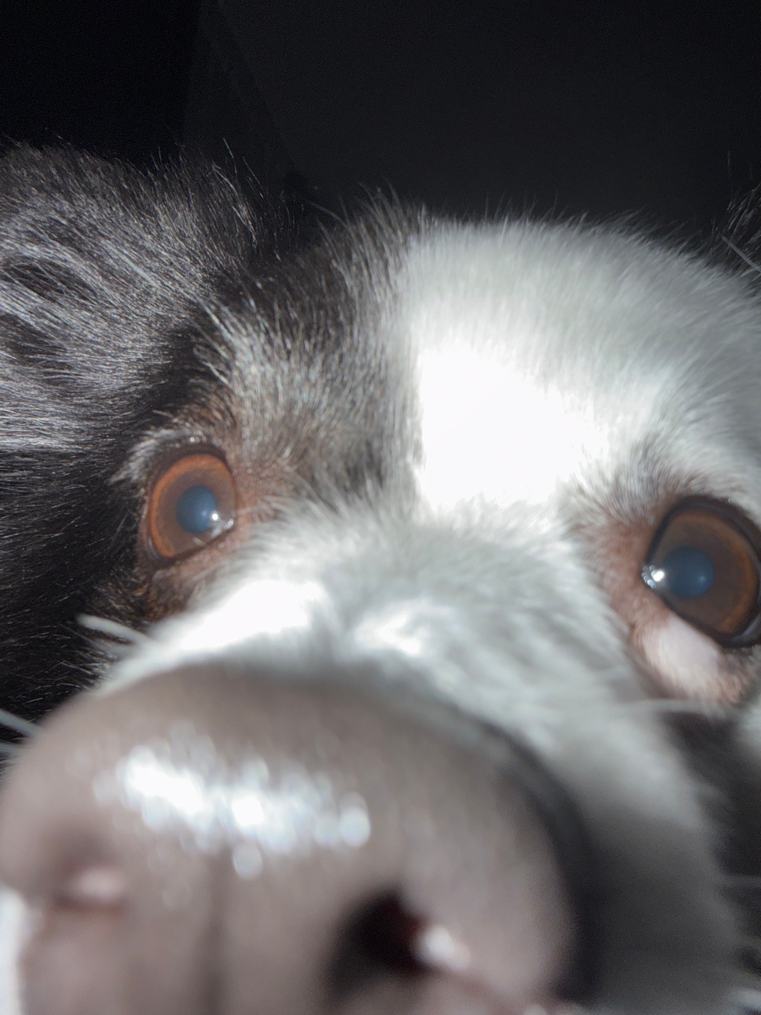 The image is a close-up, upside-down view of a black and white dog. The dog's two eyes are visible, with brown irises. A large, blurred nose dominates the right side of the frame. The background is da…read more