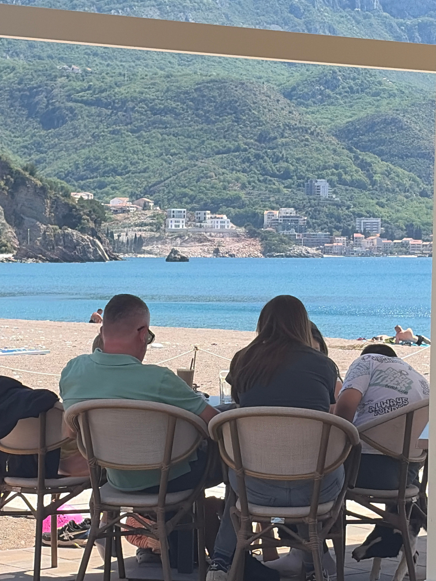 The image captures a group of people seated outdoors, likely at a restaurant or cafe, with a scenic view of Boreti, Montenegro. **People:** There are at least three individuals visible, seated on chβ¦read more