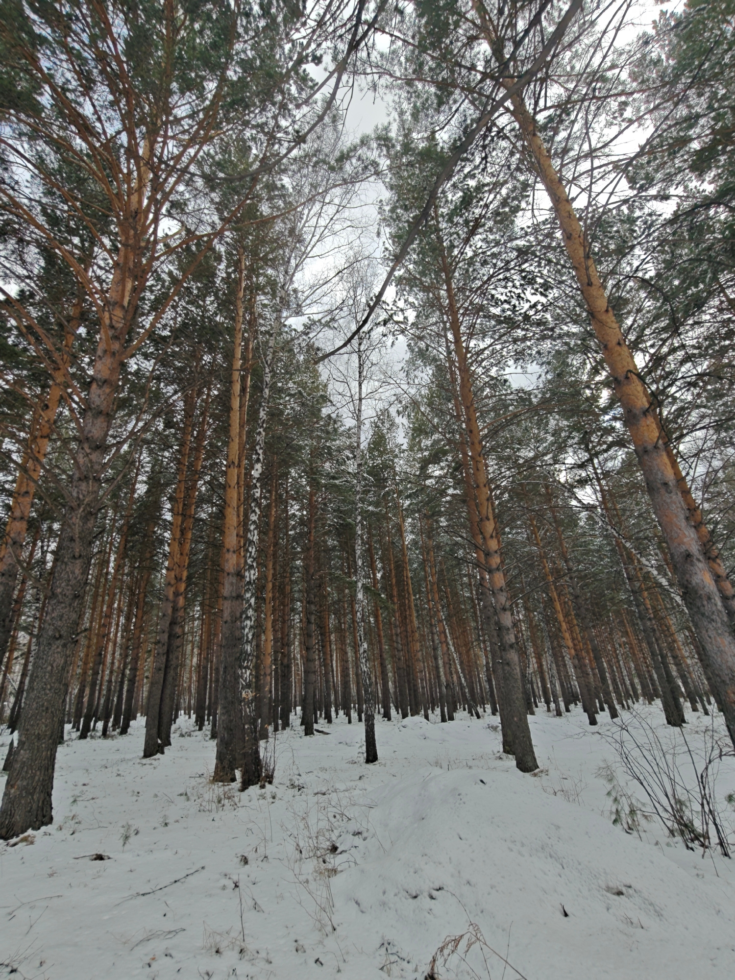 The image depicts a snow-covered forest in what appears to be a winter scene. Tall, slender trees dominate the frame, their trunks rising vertically with a perspective that makes them converge towards…read more