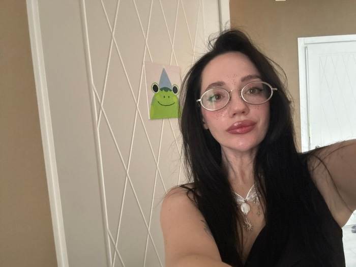 The image presents a close-up indoor self-portrait of an adult female. She has dark, long hair, partially styled in a bun on top of her head, with strands falling over her shoulders. She wears light-r…read more