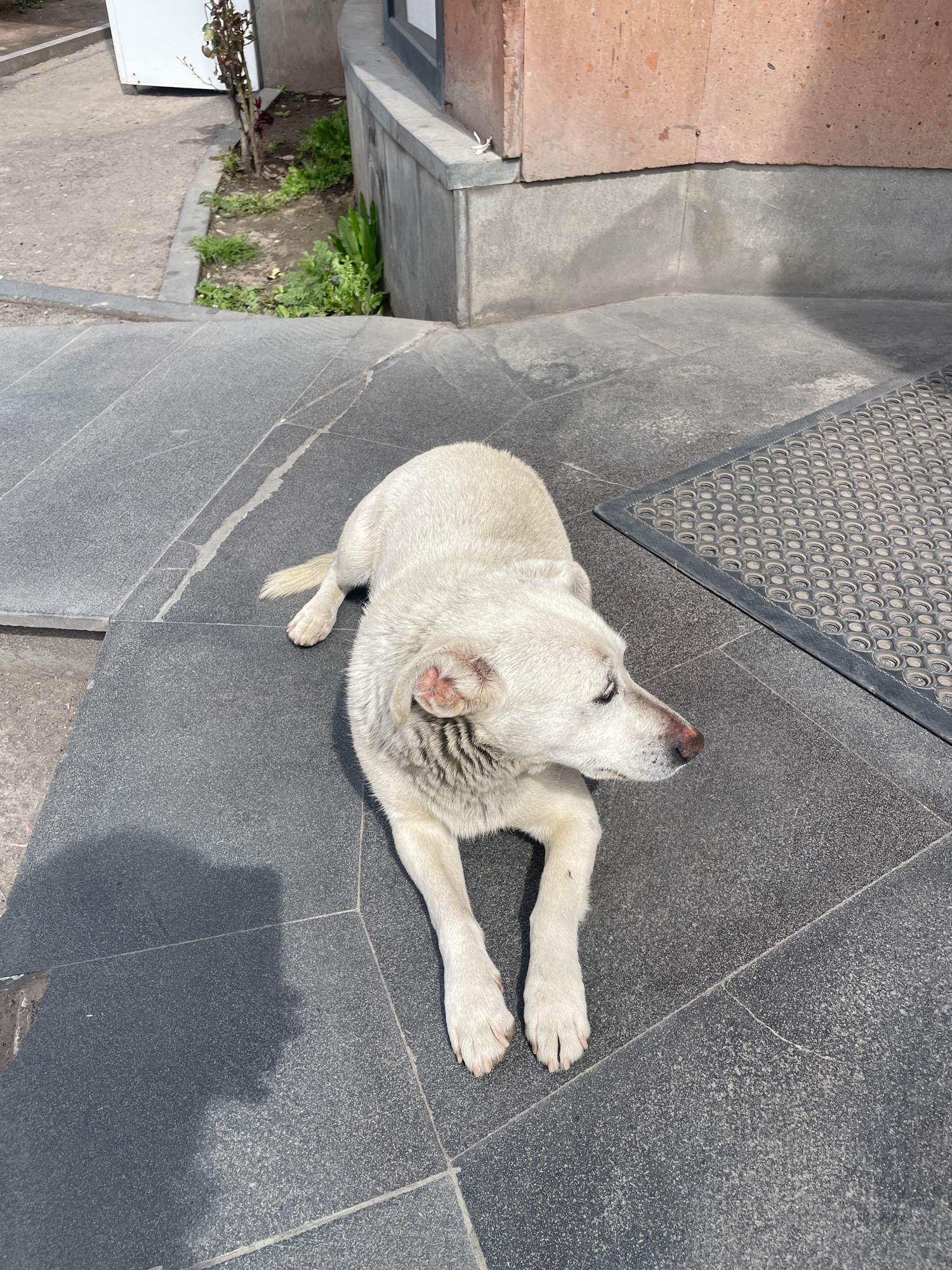 A high-angle shot depicts a white dog lying on a dark grey tiled surface. The tiles are oriented in a rectangular pattern. A dark grey rubber mat with a circular pattern is in the upper portion of the…read more