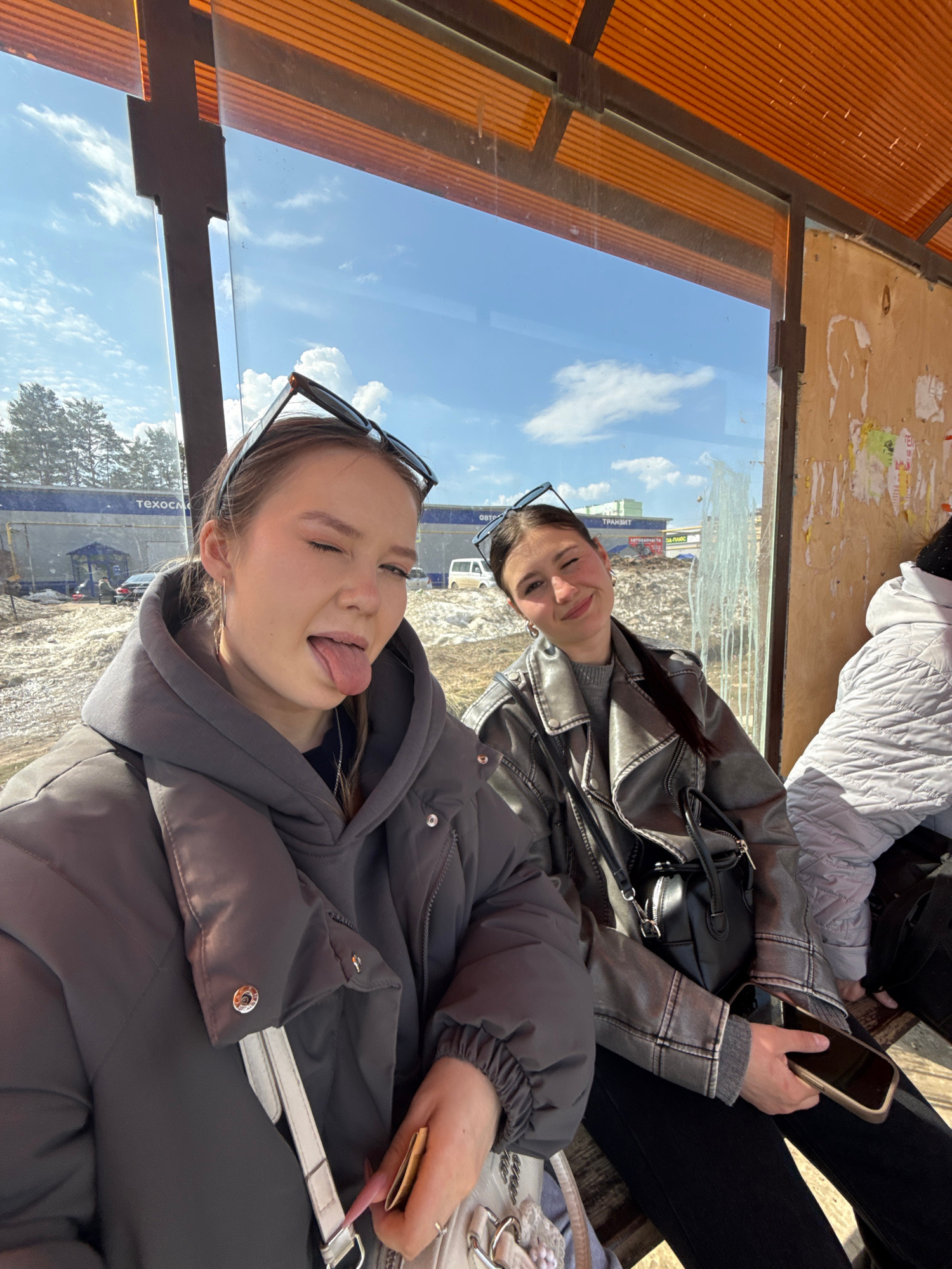 The image, oriented vertically where subjects are positioned horizontally, captures two young women sitting in a sheltered area, likely a bus stop, on a bright, cool day. In the foreground, a woman w…read more