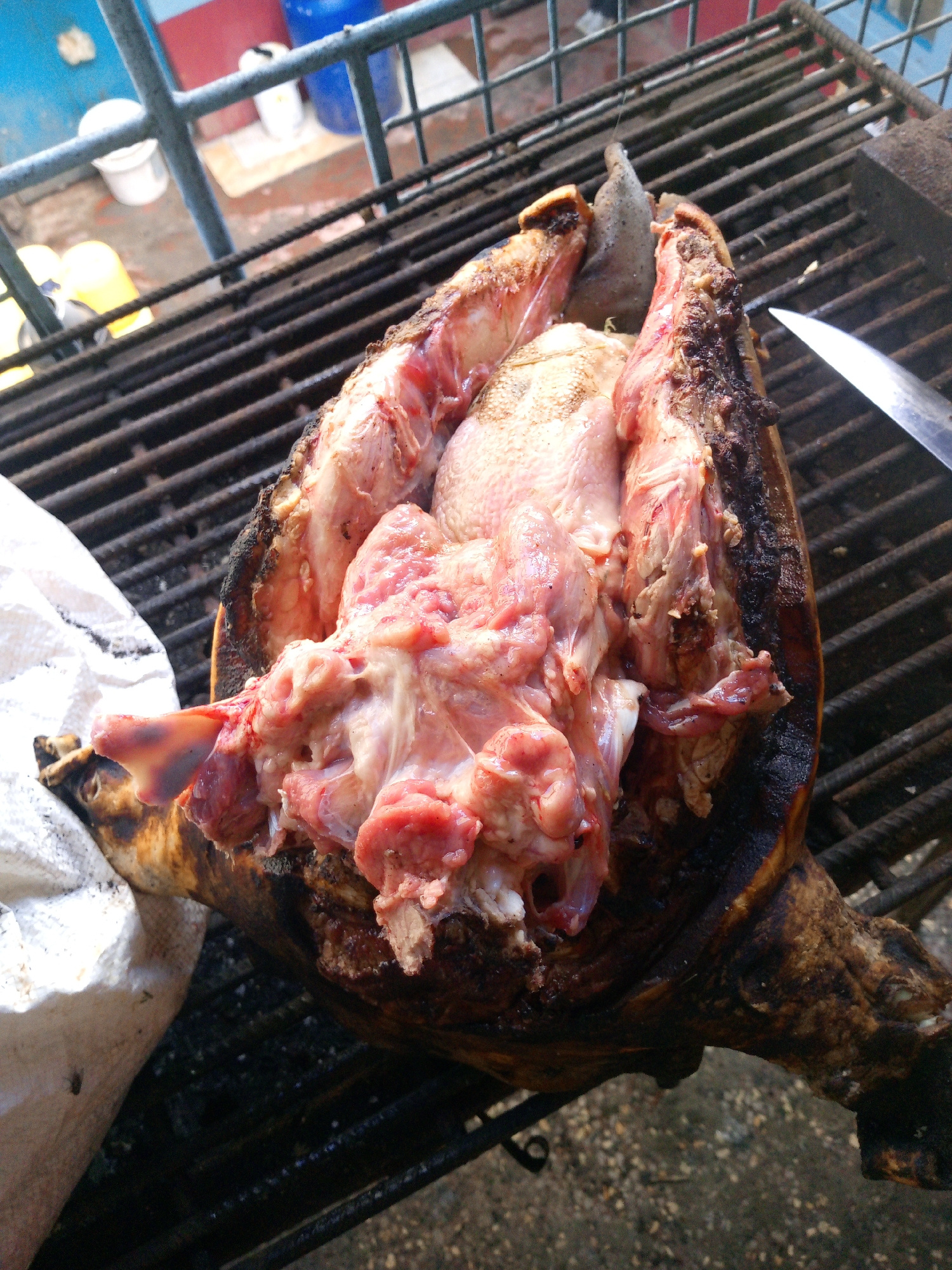 On a metal grill, a butchered turtle is displayed, its shell charred and cracked open to reveal the raw meat inside. To the left, a white bag rests alongside the grill. In the background, glimpses of…read more