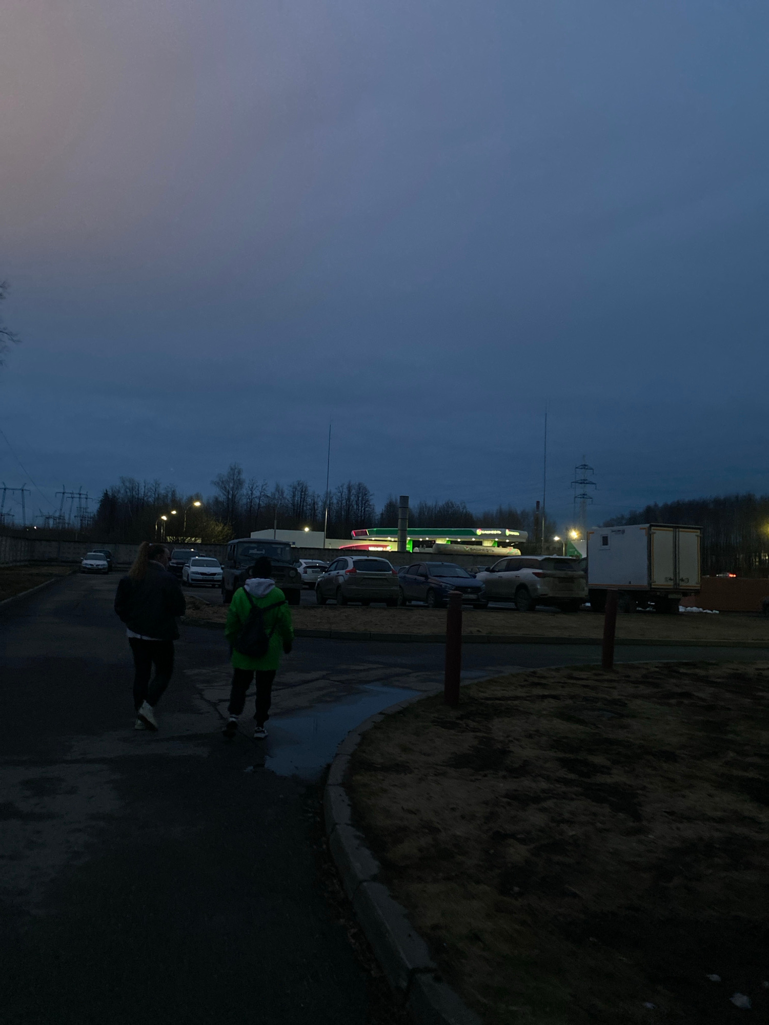 Two people are walking on a wet asphalt surface alongside a roadside area with parked cars, a gas station, and green vegetation. The sky is darkening, indicating dusk or twilight. The location appearsβ¦read more