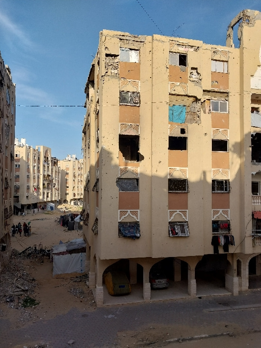 The image presents a severely damaged street scene in Khan Yunis, Palestinian Territory, under a clear blue sky. The prominent subject is a multi-story, light-beige apartment building exhibiting exten…read more