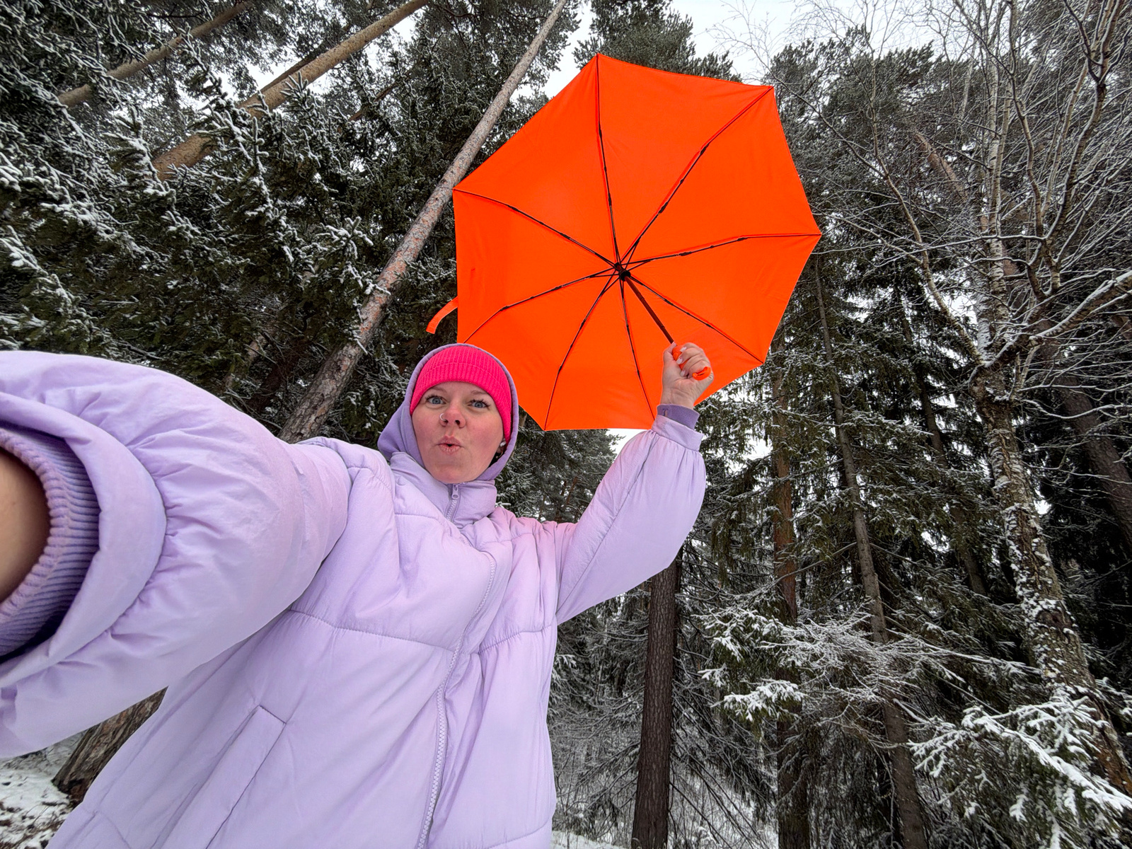 A person wearing a lavender puffy coat and a pink beanie is holding an orange umbrella. The person is positioned against a backdrop of snow-covered trees in a forest, possibly in or near the city of Cā¦read more