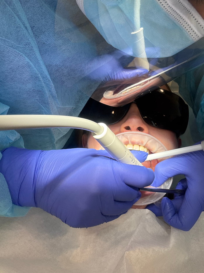 The image depicts a close-up, high-angle view of a dental procedure in progress. The scene focuses on the mouth and chin area of a patient, who is wearing dark protective eyewear. A clear plastic mout…read more