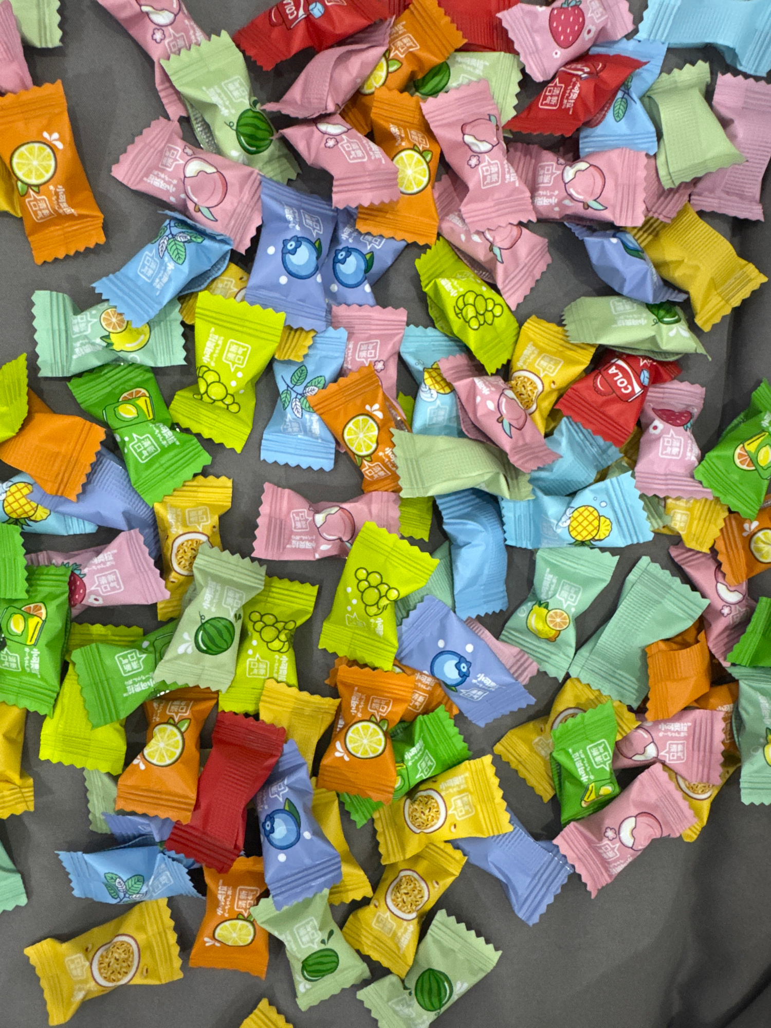 The image shows a collection of individually wrapped candies scattered on a gray surface. The wrappers come in various colors, including pink, red, orange, yellow, green, and blue. Each wrapper featur…read more