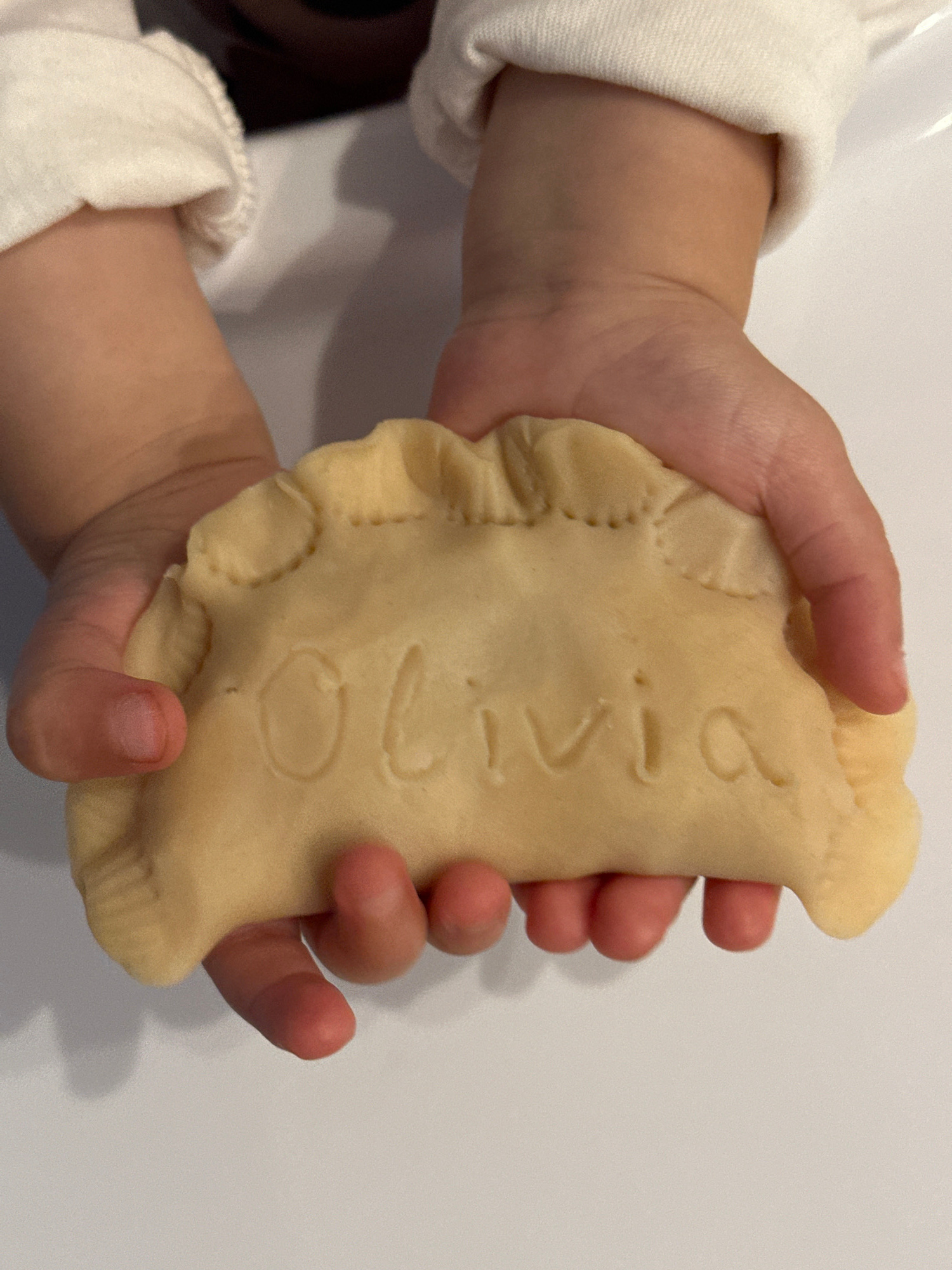 A close-up shot shows a child's hands holding a pastry with the name "Olivia" inscribed on it. The pastry has a crimped edge. The child is wearing a white, long-sleeved garment. The background is a pl…read more