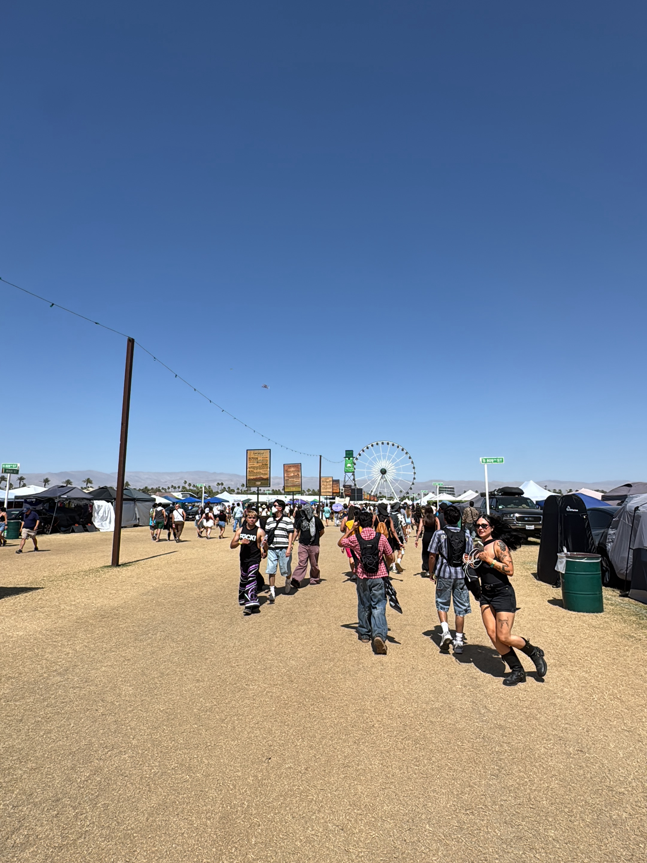 The image depicts an outdoor scene at the Coachella Valley Music and Arts Festival in Indio, California, United States, on a clear, sunny day. The ground is a dirt-colored expanse where numerous festi…read more