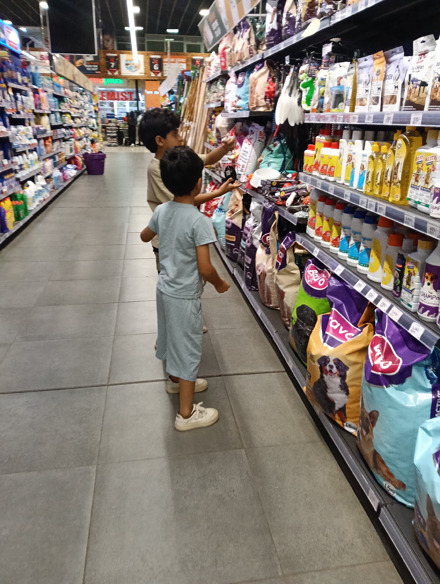 Two boys stand in a supermarket aisle, likely in Nairobi, Kenya, examining pet food and supplies on the shelves. The aisle is filled with various products, including dog food bags and grooming supplie…read more