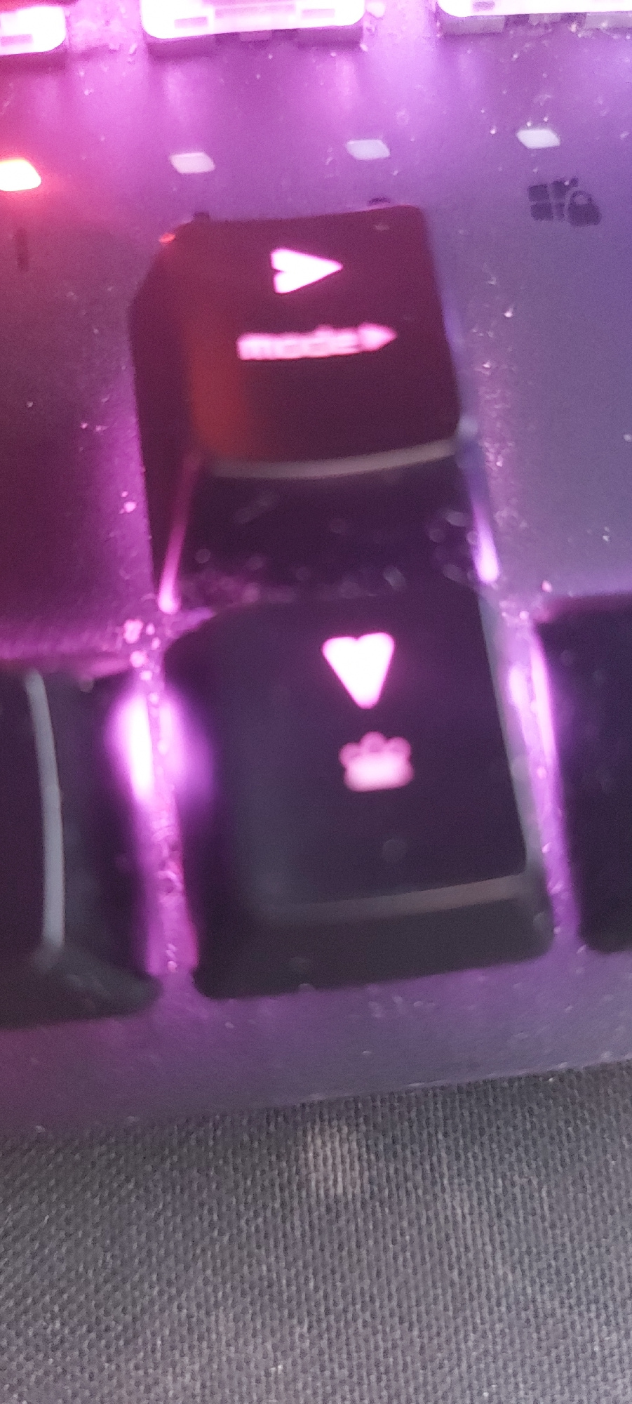 The image shows a close-up of a keyboard with illuminated keys. The keys are black, with illuminated symbols in pink. The symbols visible are an upward arrow with a vertical line next to it, and a rig…read more
