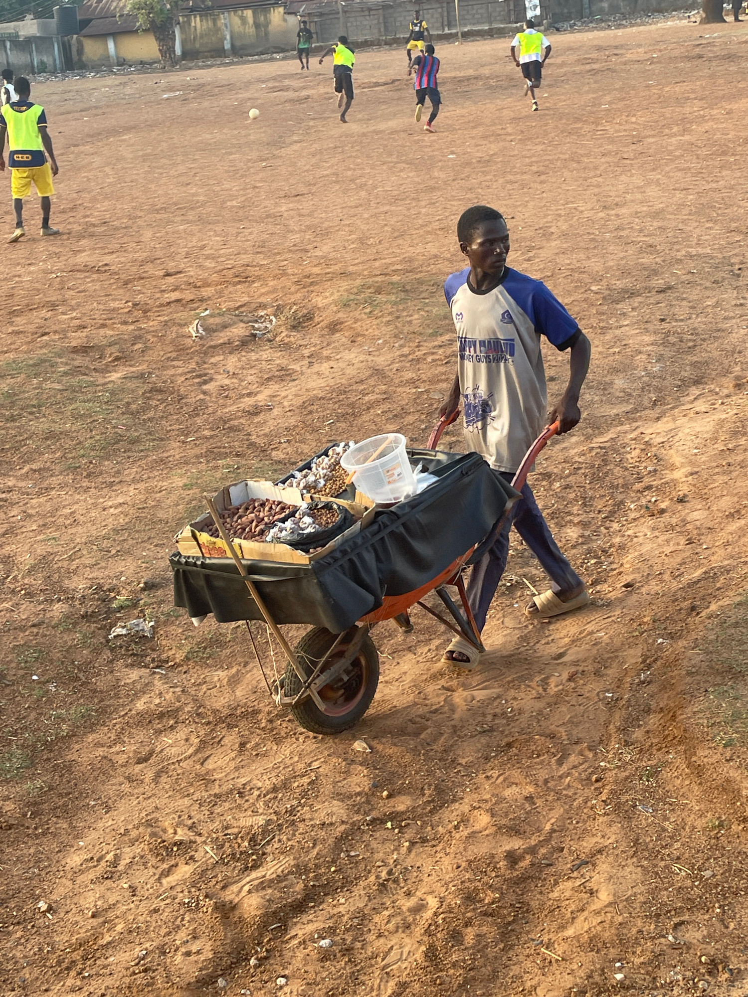 A man stands in a dirt field, pushing a cart containing peanuts, garlic, and other items, suggesting he is a street vendor. In the background, several individuals are playing what appears to be soccerβ¦read more