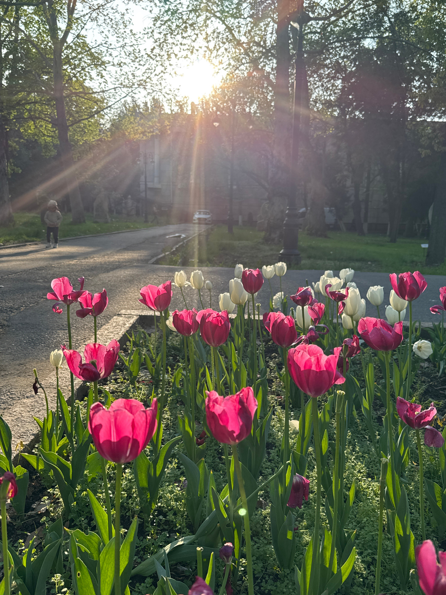 The image shows a flower bed with red and white tulips bordering a sidewalk in Bishkek City, Kyrgyzstan. The sun is low in the sky, casting long rays of light through the trees. A person wearing a hat…read more