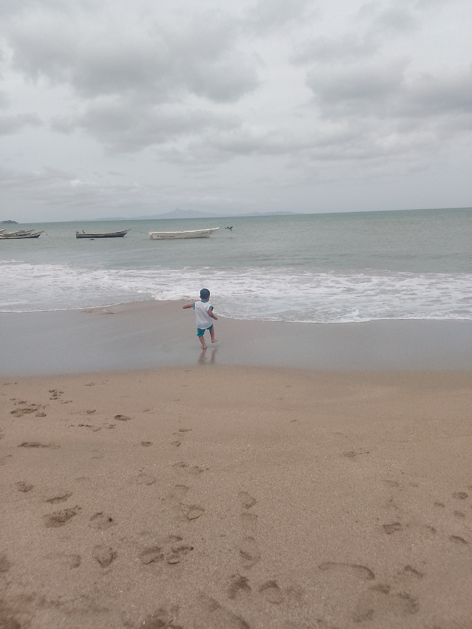 A wide-angle, slightly high-angle shot depicts a beach in Juan Griego, Venezuela, under a cloudy sky. A small child, wearing a white shirt and blue shorts, is seen from the back, running towards the w…read more