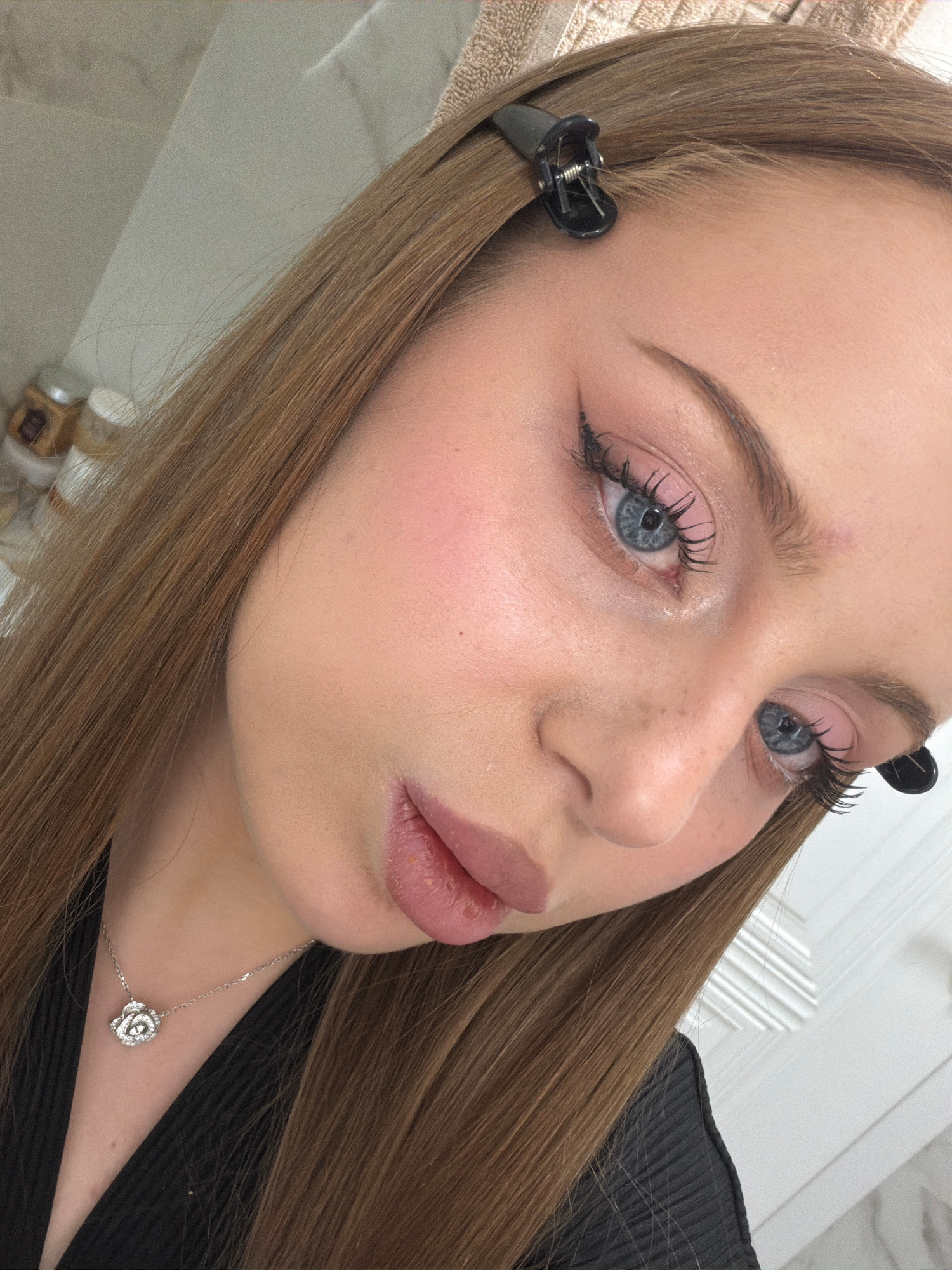 A close-up, tilted shot of a fair-skinned young woman with light brown, straight hair. Black hair clips secure her hair near her temples. She has light blue eyes, and her makeup includes a soft pink e…read more