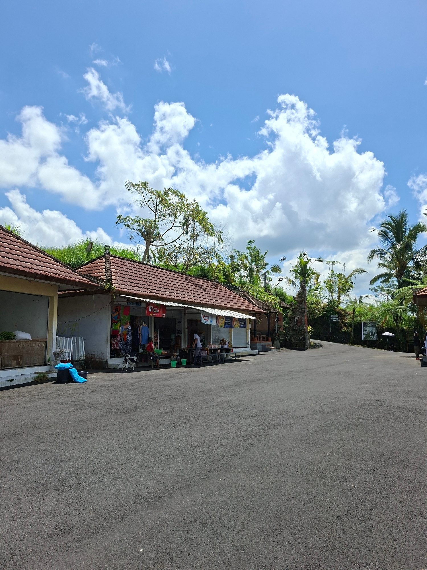 The image depicts a scene in Petang, Indonesia. A paved road stretches along the right side of the frame. Along the left side of the road is a low building with a red-tiled roof. The building appears…read more