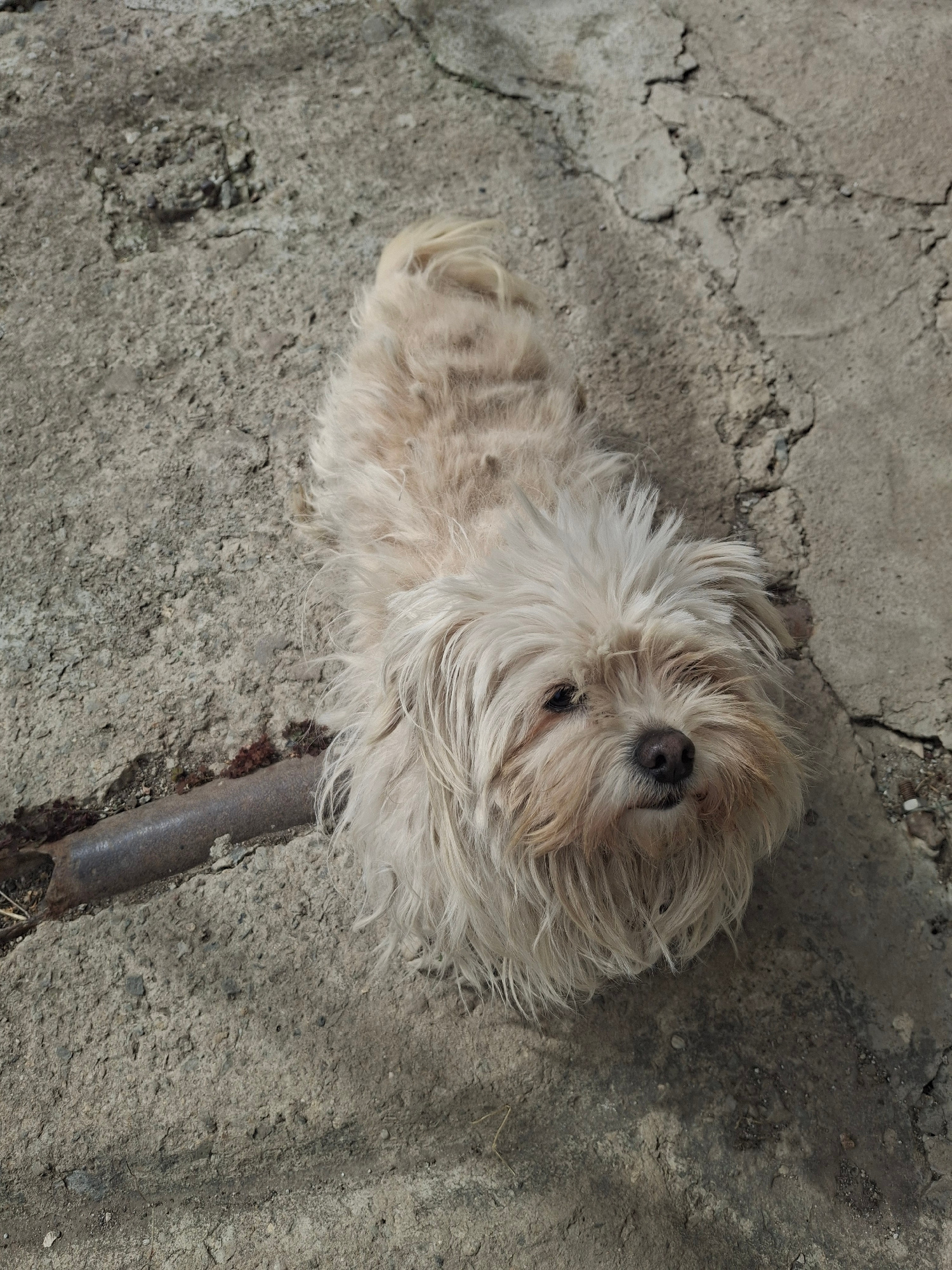 A small, fluffy dog with predominantly off-white and light brown fur is depicted in a close-up, overhead shot. The dog is lying down on a textured, grey concrete or stone surface. Its long, somewhat d…read more