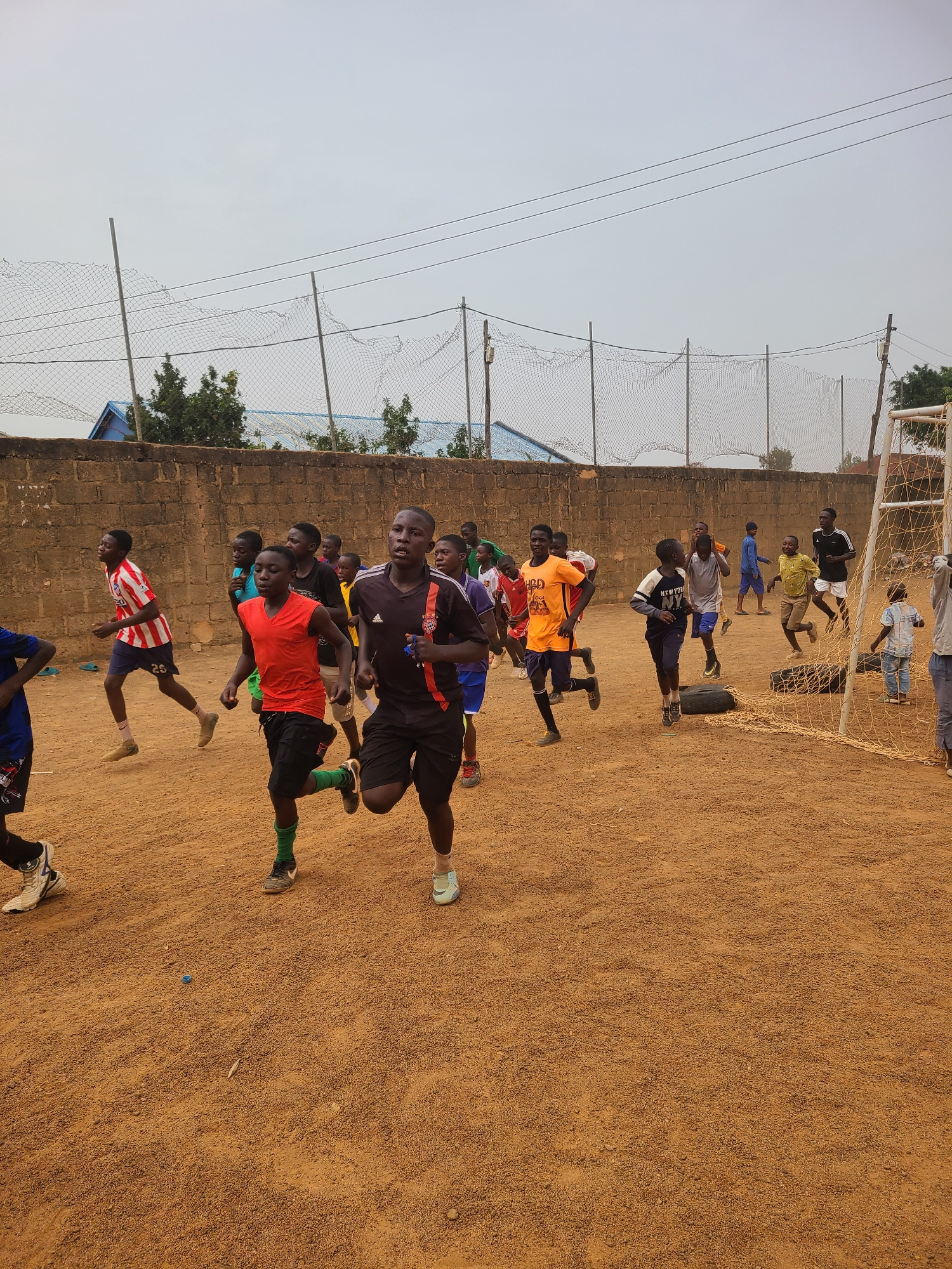 The image shows a group of young men training on a dirt soccer field in Jos, Nigeria. They appear to be doing running drills in front of a soccer goal with a net. A brick wall runs along the side of t…read more
