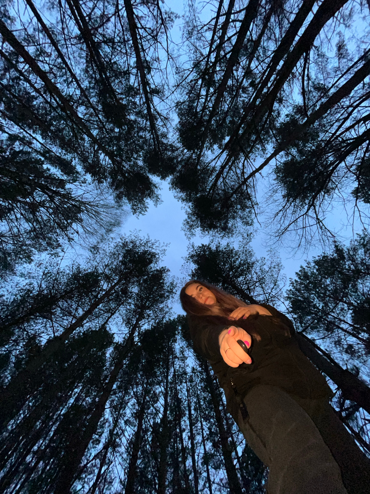 The image depicts a low-angle view upwards through a dense forest, presumably located in or near Chaikovsky, Russia. Tall, dark tree trunks and branches fill most of the frame, converging towards a sm…read more