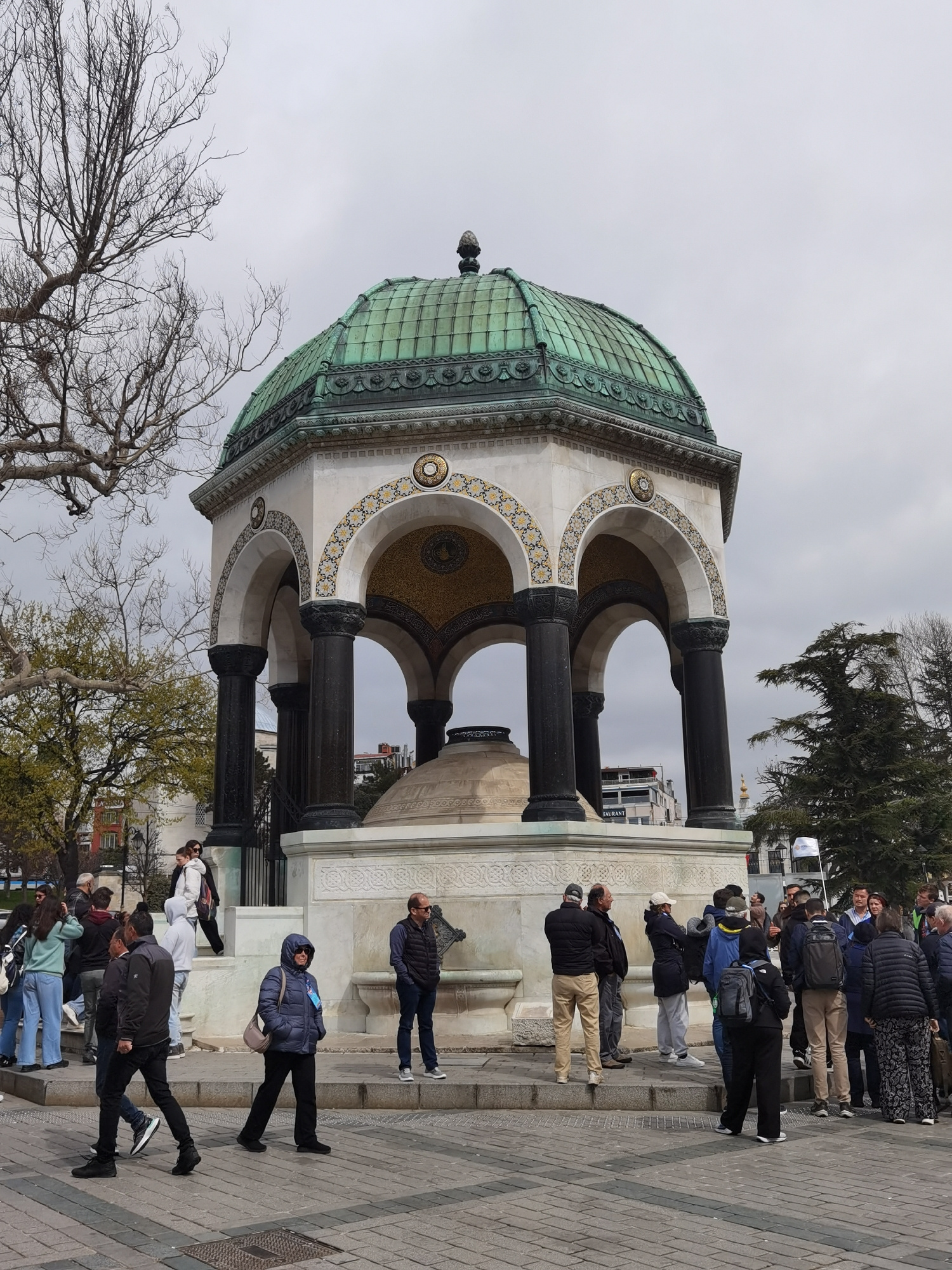 The image displays a lively scene around the German Fountain (Alman Çeşmesi) in Sultanahmet Square, Istanbul, Turkey. The fountain is the central subject, characterized by its distinctive green, patin…read more