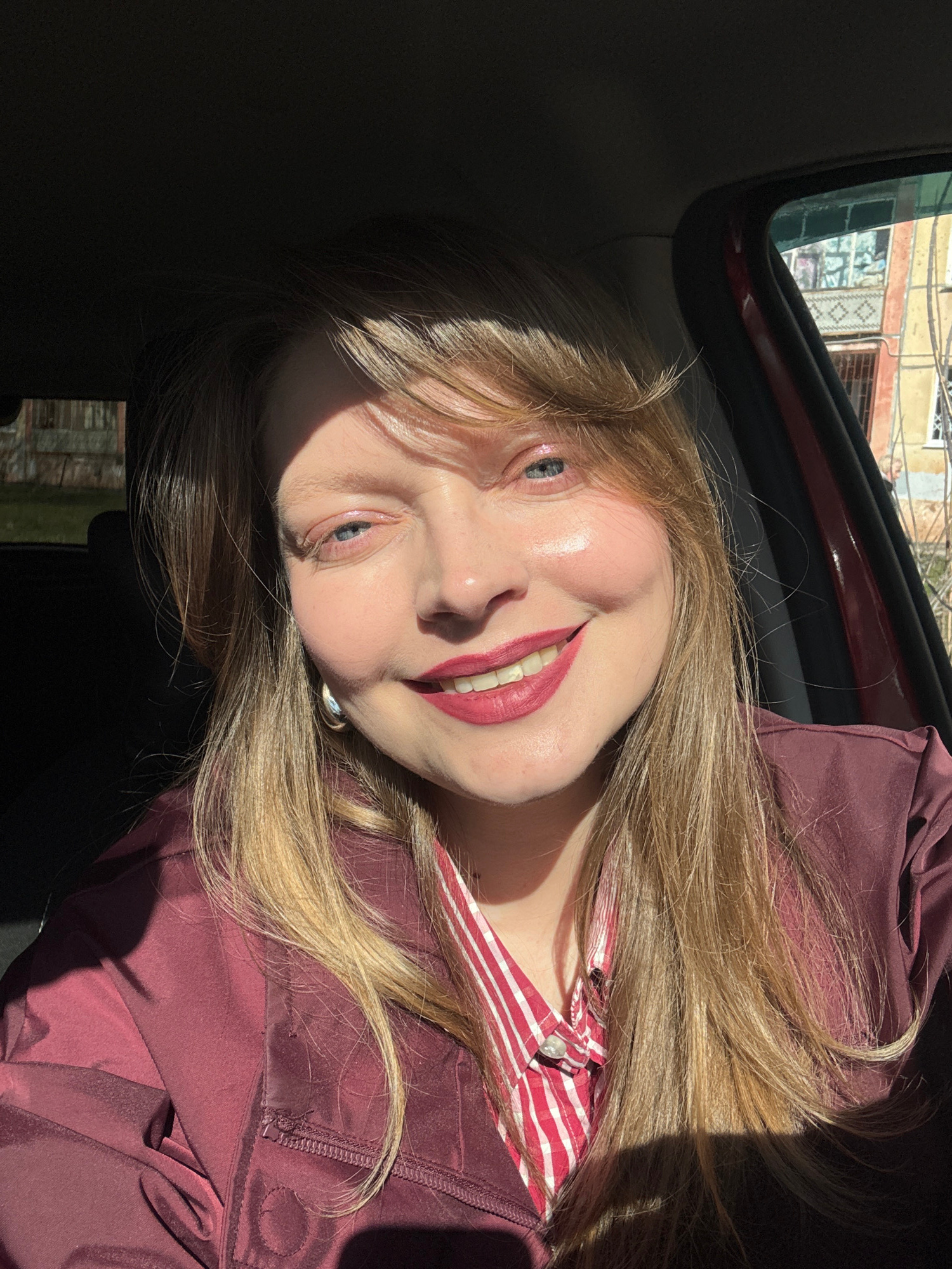 A light-skinned female with blue eyes and blonde hair is sitting in a car, smiling at the camera. She is wearing a burgundy jacket over a red and white striped shirt. The sun is shining on her face. T…read more