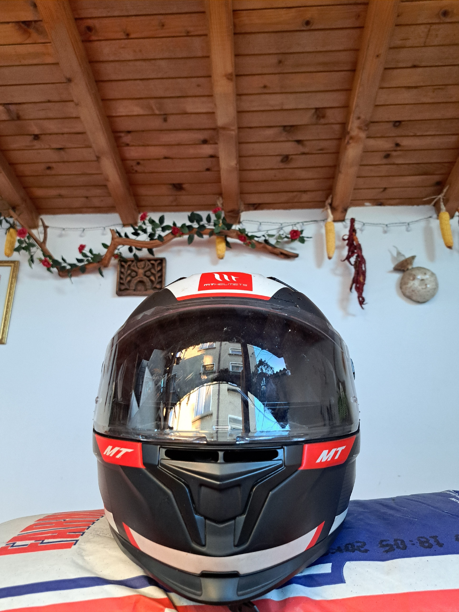 A motorcycle helmet is in the foreground. The helmet is black with red and white accents. The visor is clear and reflects the outside environment. Behind the helmet is a white wall decorated with a wo…read more