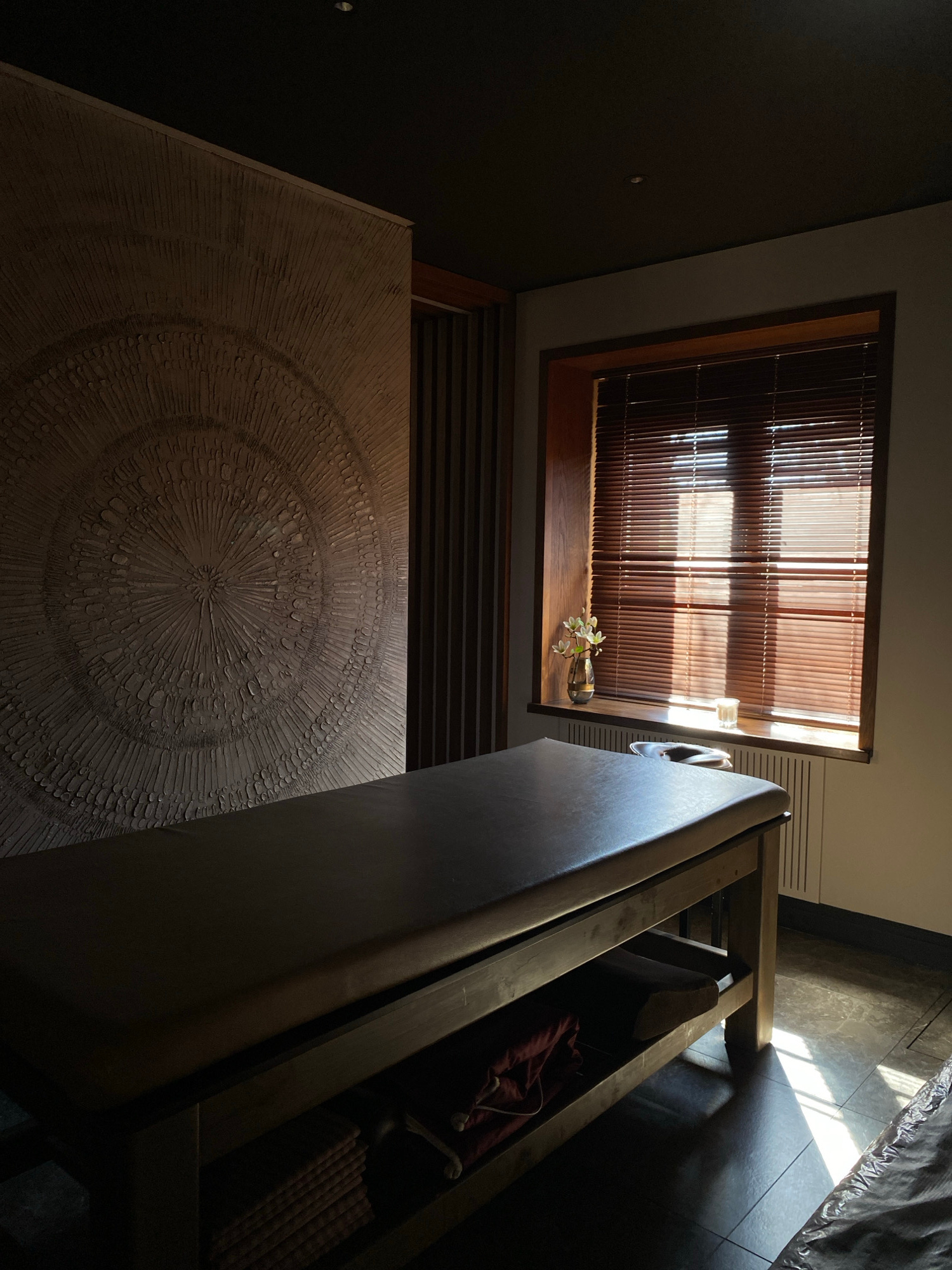 A high-angle shot captures a dim interior with several notable elements. A square window with bamboo blinds and a small vase containing foliage is set into a wall. A textured, circular design is visib…read more