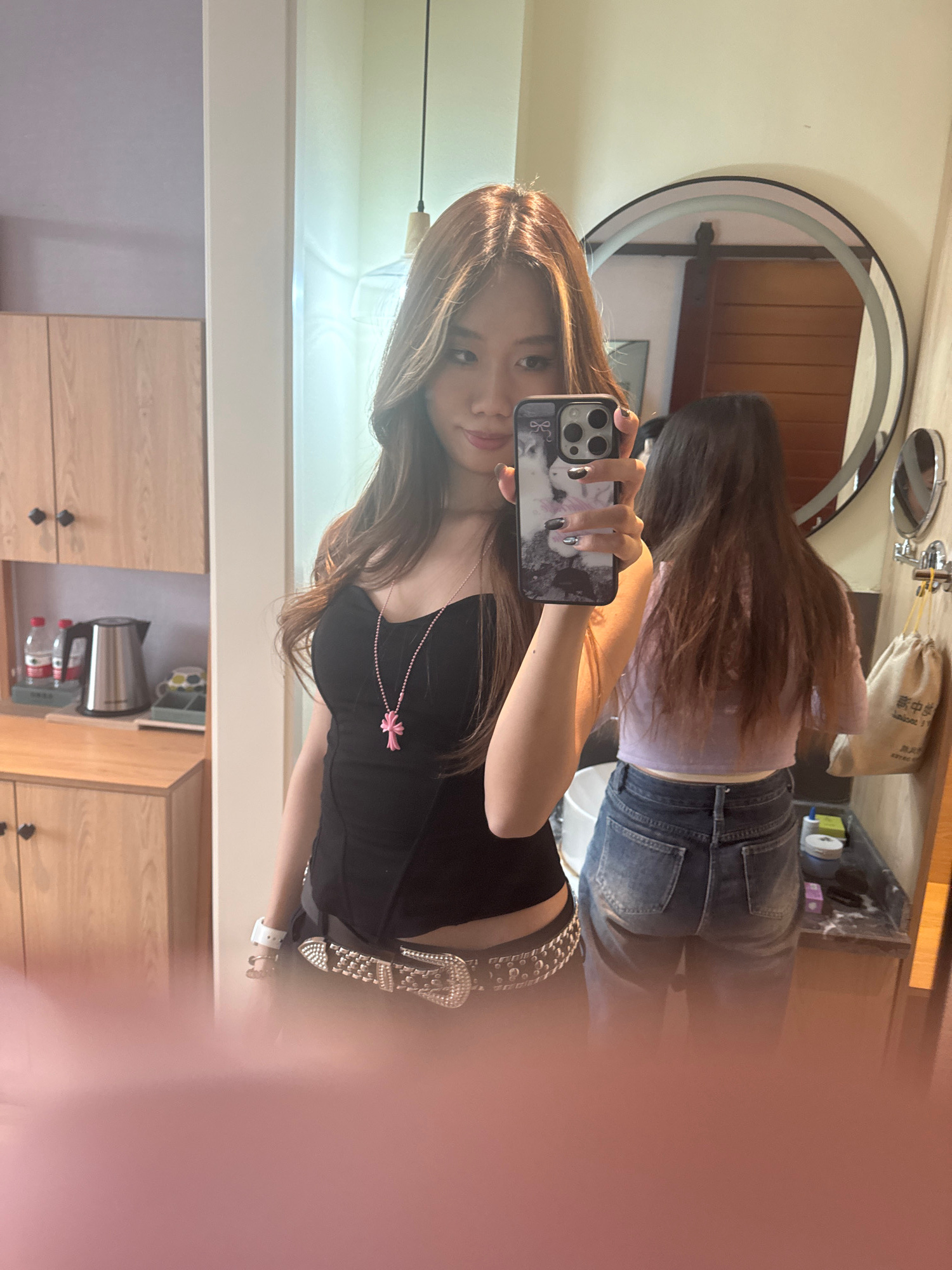 A young woman takes a mirror selfie in an indoor setting, likely a hotel room or apartment in Jiayuguan, China. She is positioned on the right side of the frame (when viewed upright), holding a smartp…read more